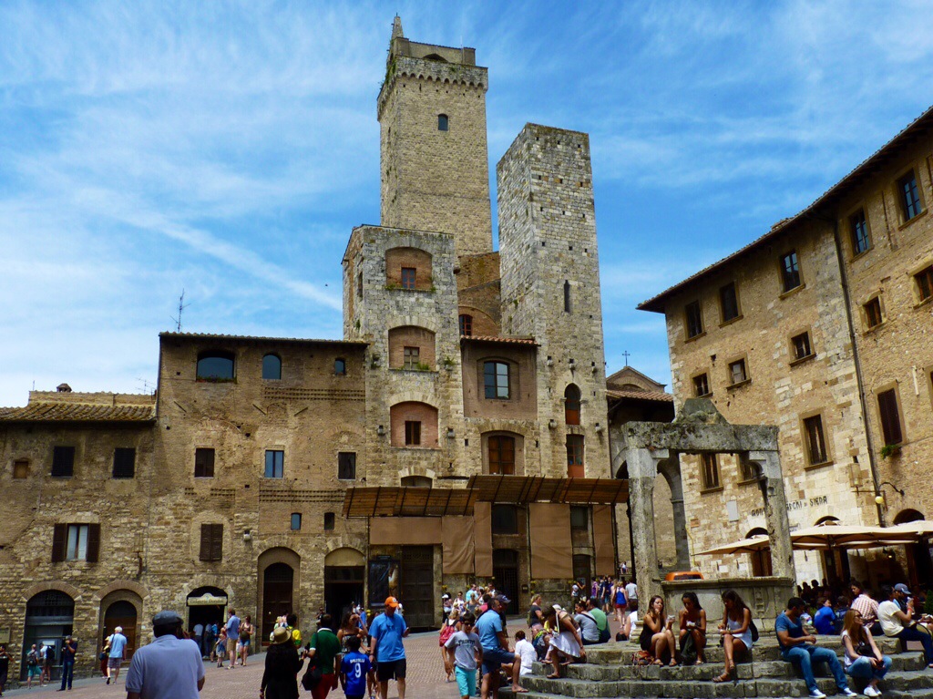 Et on a dormis comme des rois, de sorte que tous étaient en forme au réveil! En fait, nous sommes tous en forme et de bonne humeur. Sauf peut-être une réaction que je fais depuis deux jours qui m’a obligée à porter un chemisier à manches longues aujourd’hui… Après avoir fait une petite grasse matinée, petit déjeuner et départ pour San Geminiano, la ville aux 14 tours qui en a déjà eu 70. J’avais eu un coup de cœur pour cet endroit il y a 25 ans, un nouveau vers la fin des années 90 et j’ai autant aimé ma visite aujourd’hui…