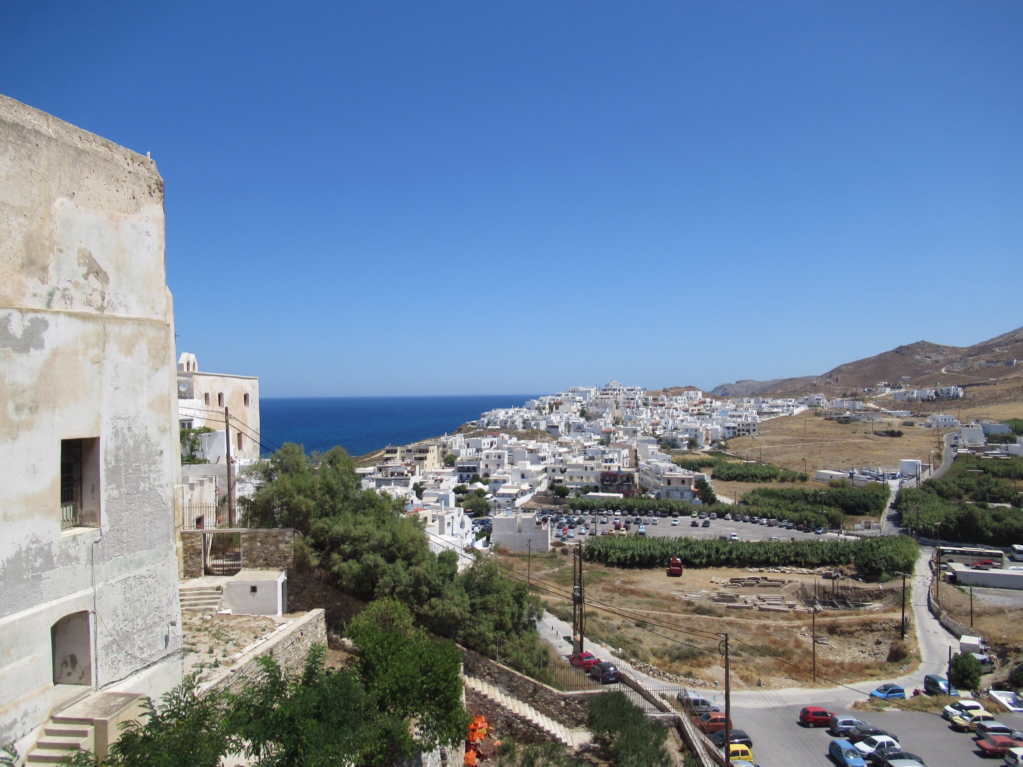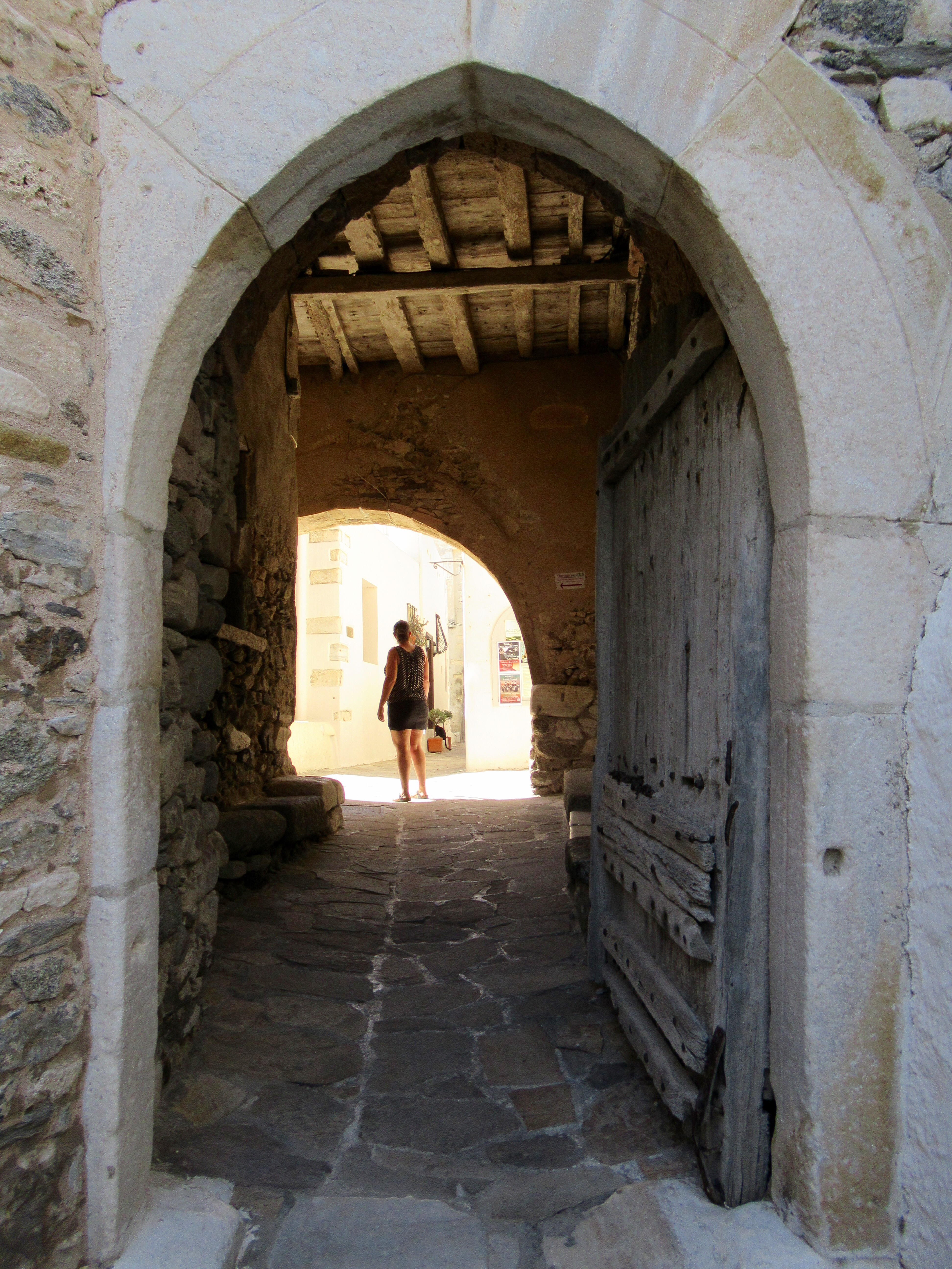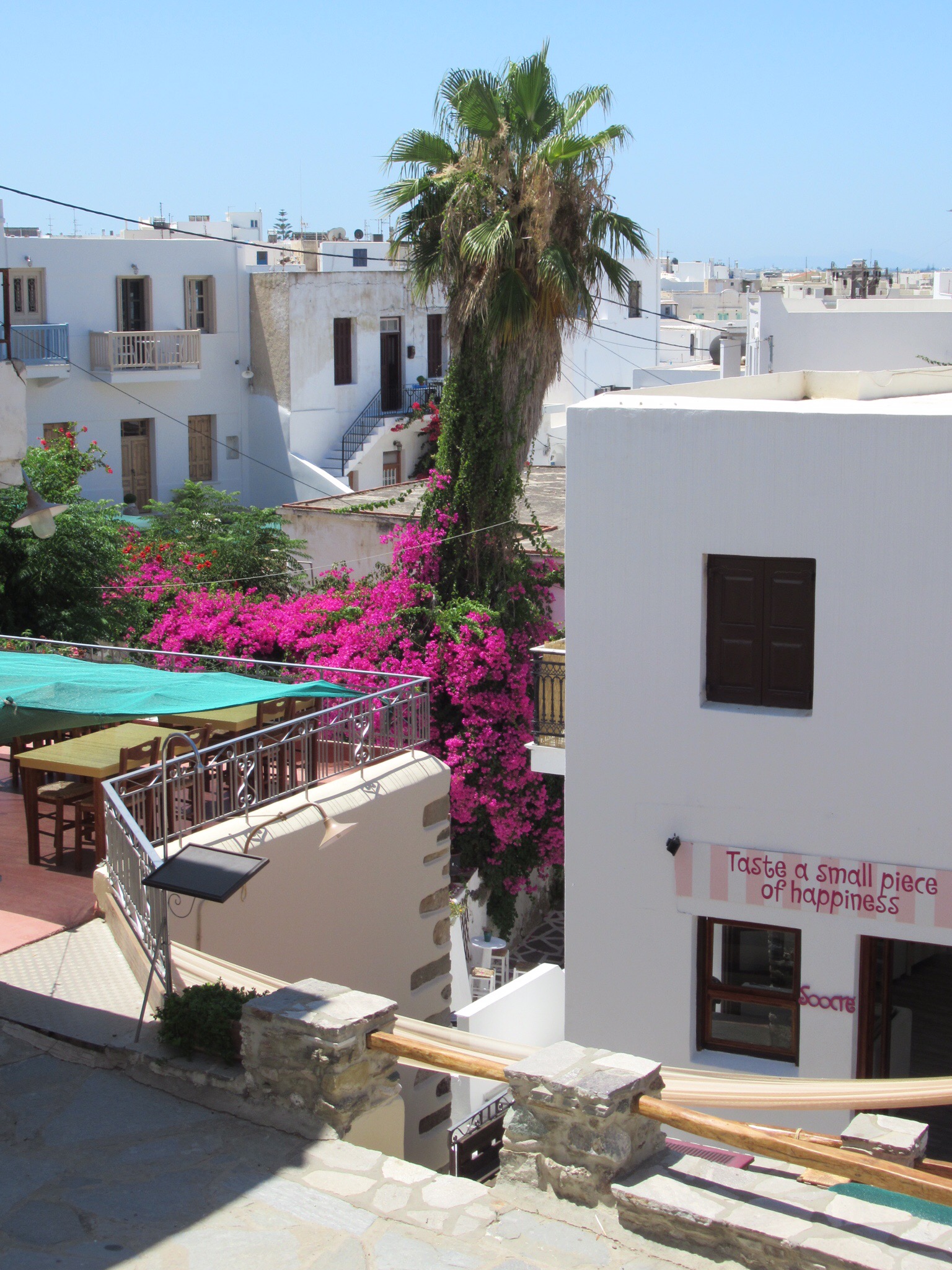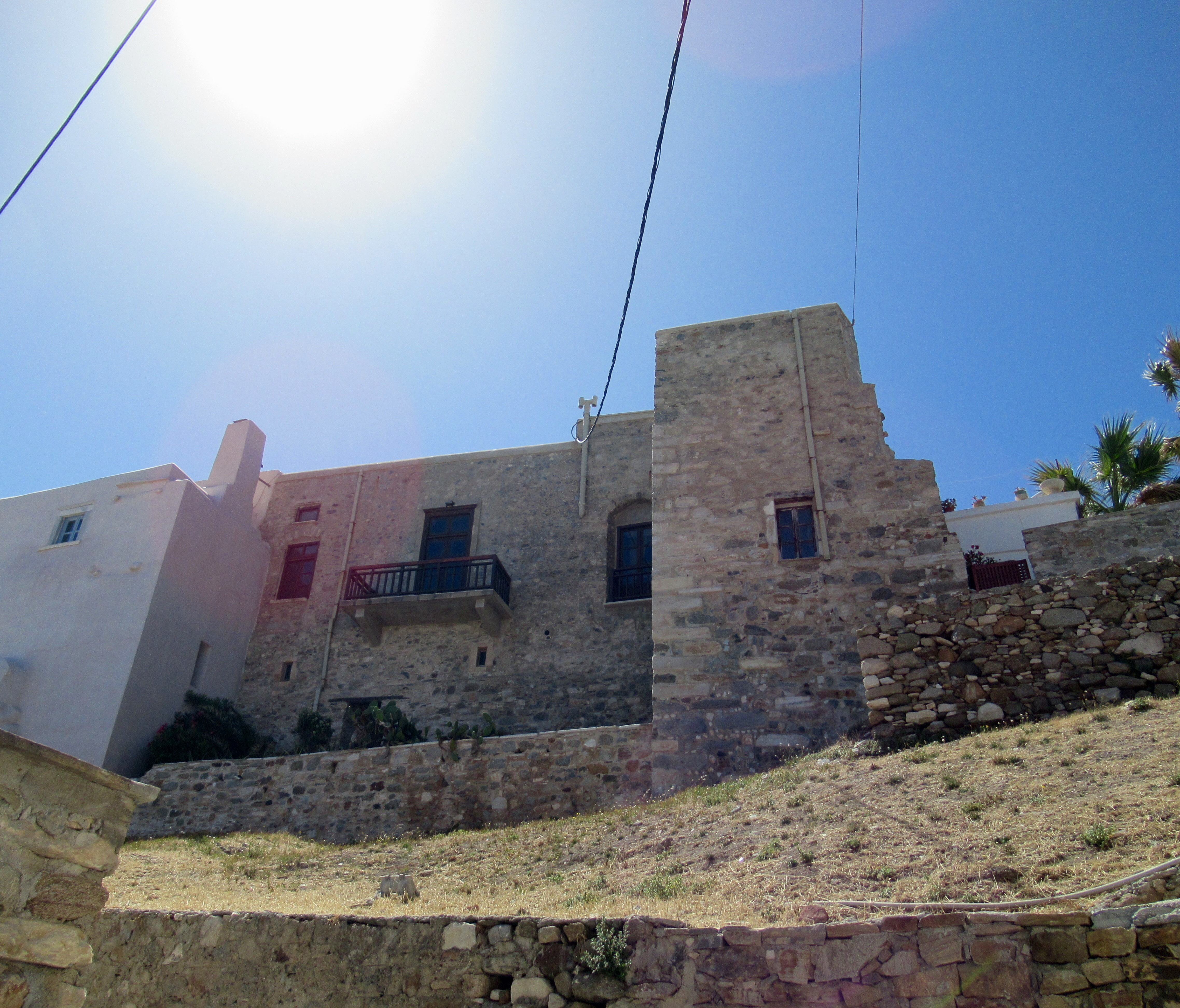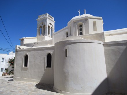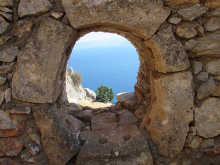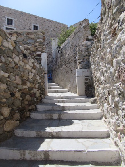 Ce matin, après un petit déjeuner toujours sans café (jamais de cafetière sinon que d’infectes sachet d’instantanés) nous partons gravir les venelles menant au Kastro, l’ancienne Naxos. Les ruelles toujours plus étroites et basses (attentions à vos têtes si vous dépassez le 5’8″!!!) y mènent toutes. De nombreuse chapelles, des musées, quelques expositions et LE café « 1739 » nous charment à coups sûrs! Ce café, construit dans l’ancien réfectoire qu’occupaient les ursulines, offre une vue imprenable sur tout Naxos. Petit moment de recueillement pour Mélanie qui a étudié chez elles à Québec. Elle fera sans doute un spécial pour les anciennes consœurs. Le café y est plus qu’excellent!