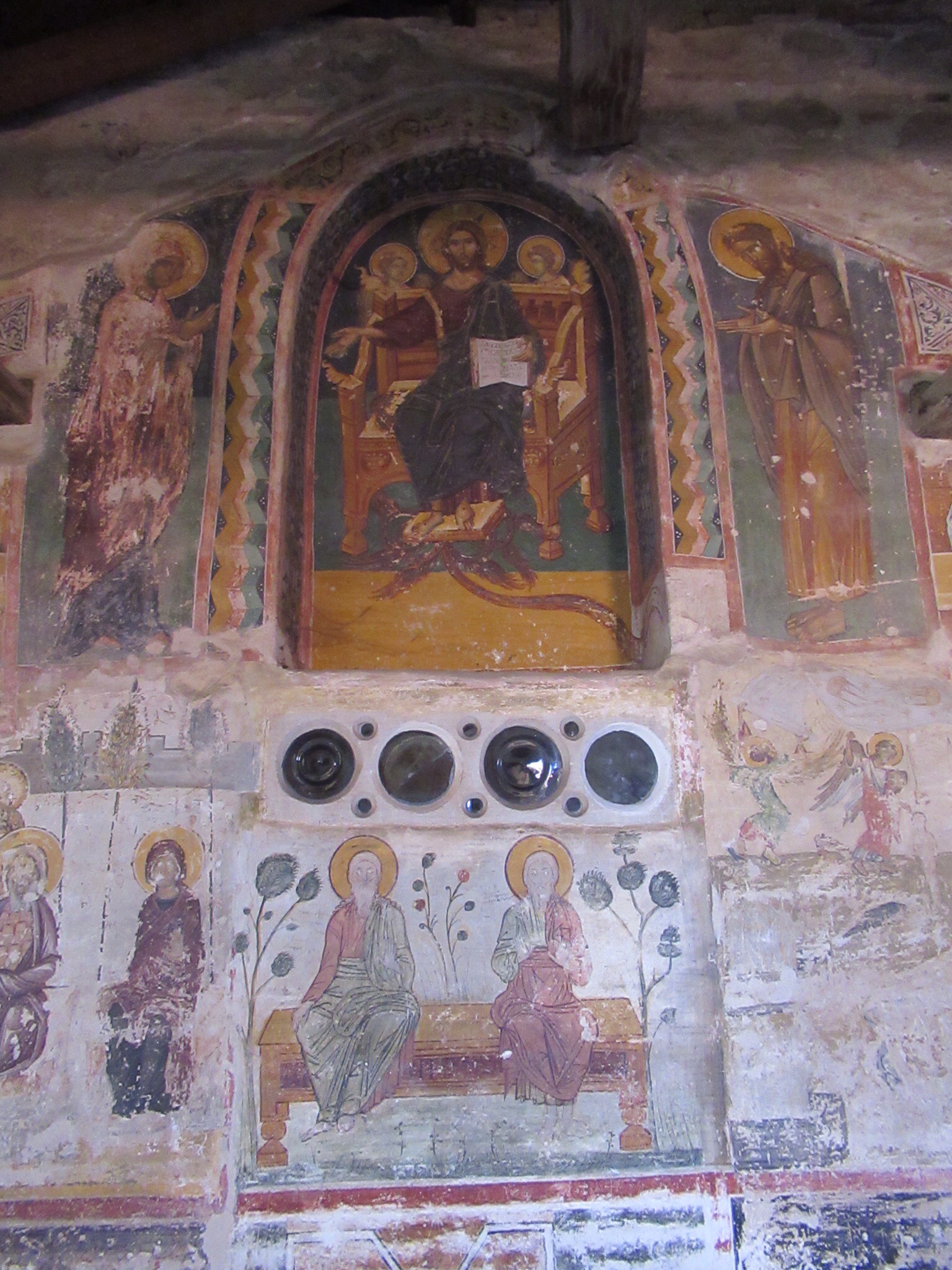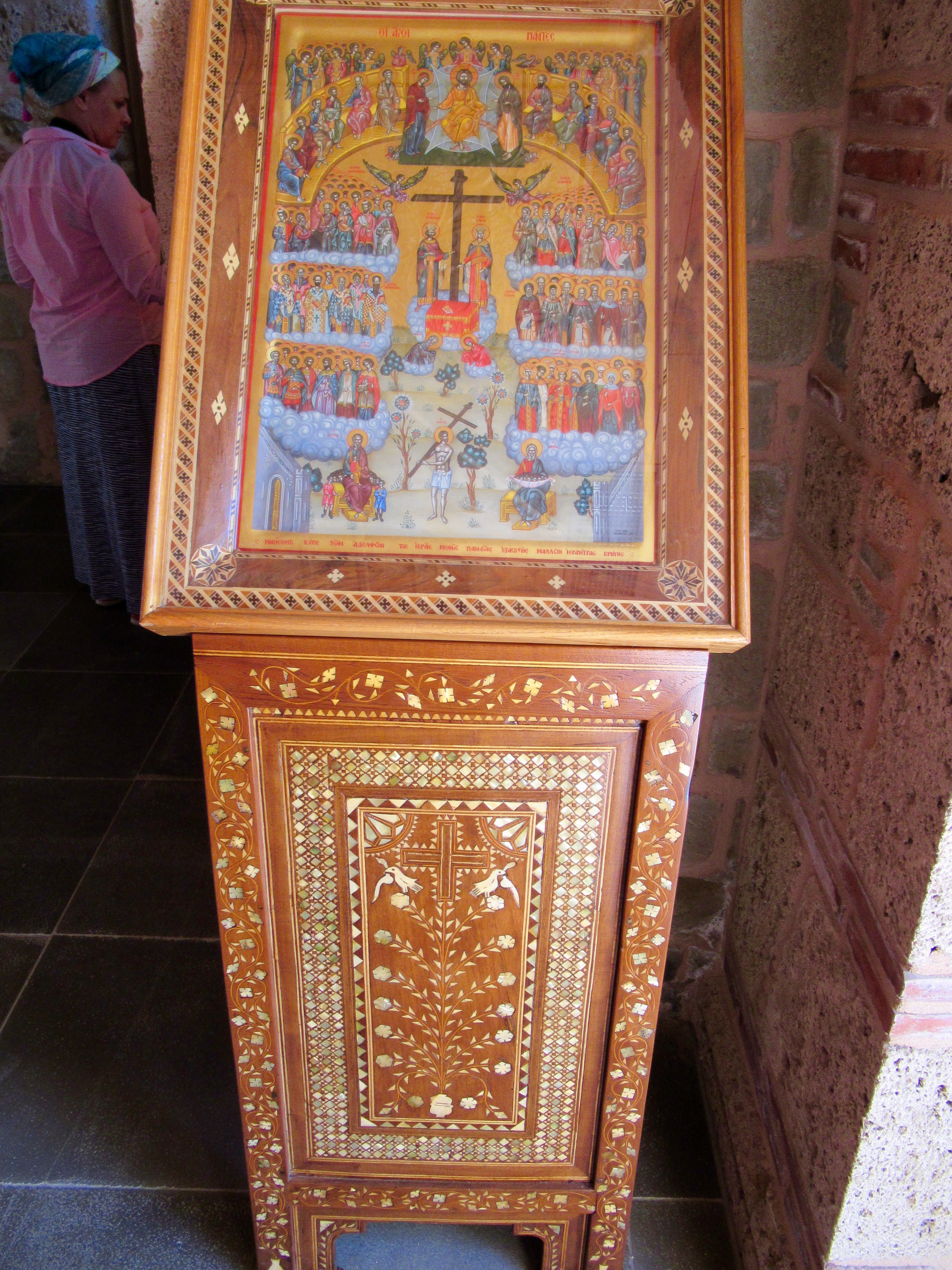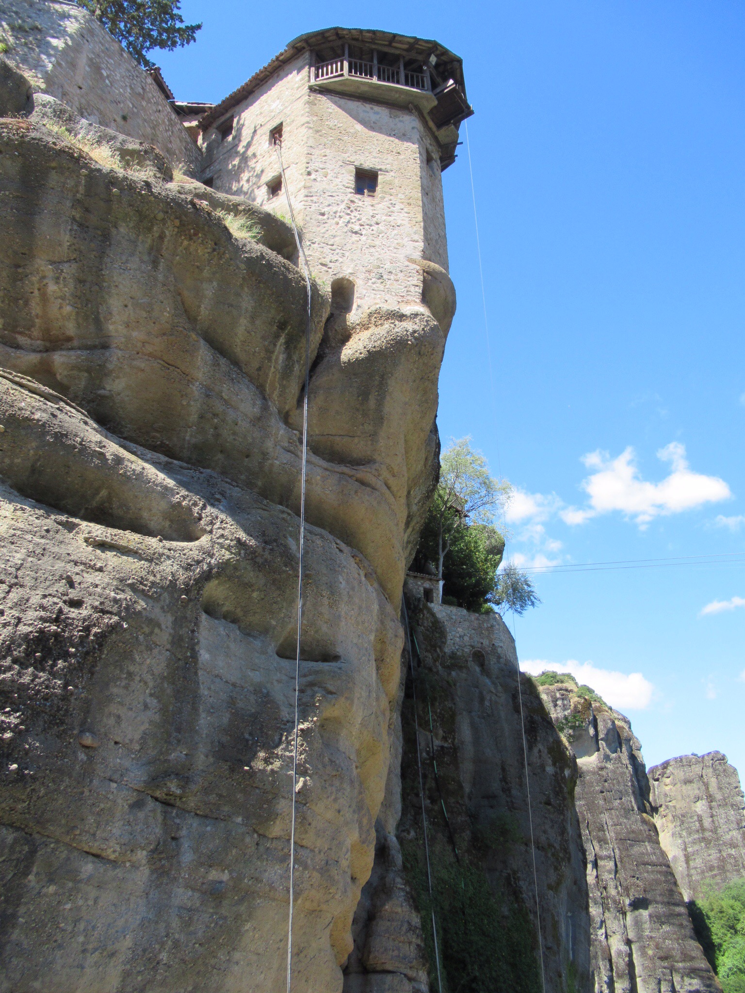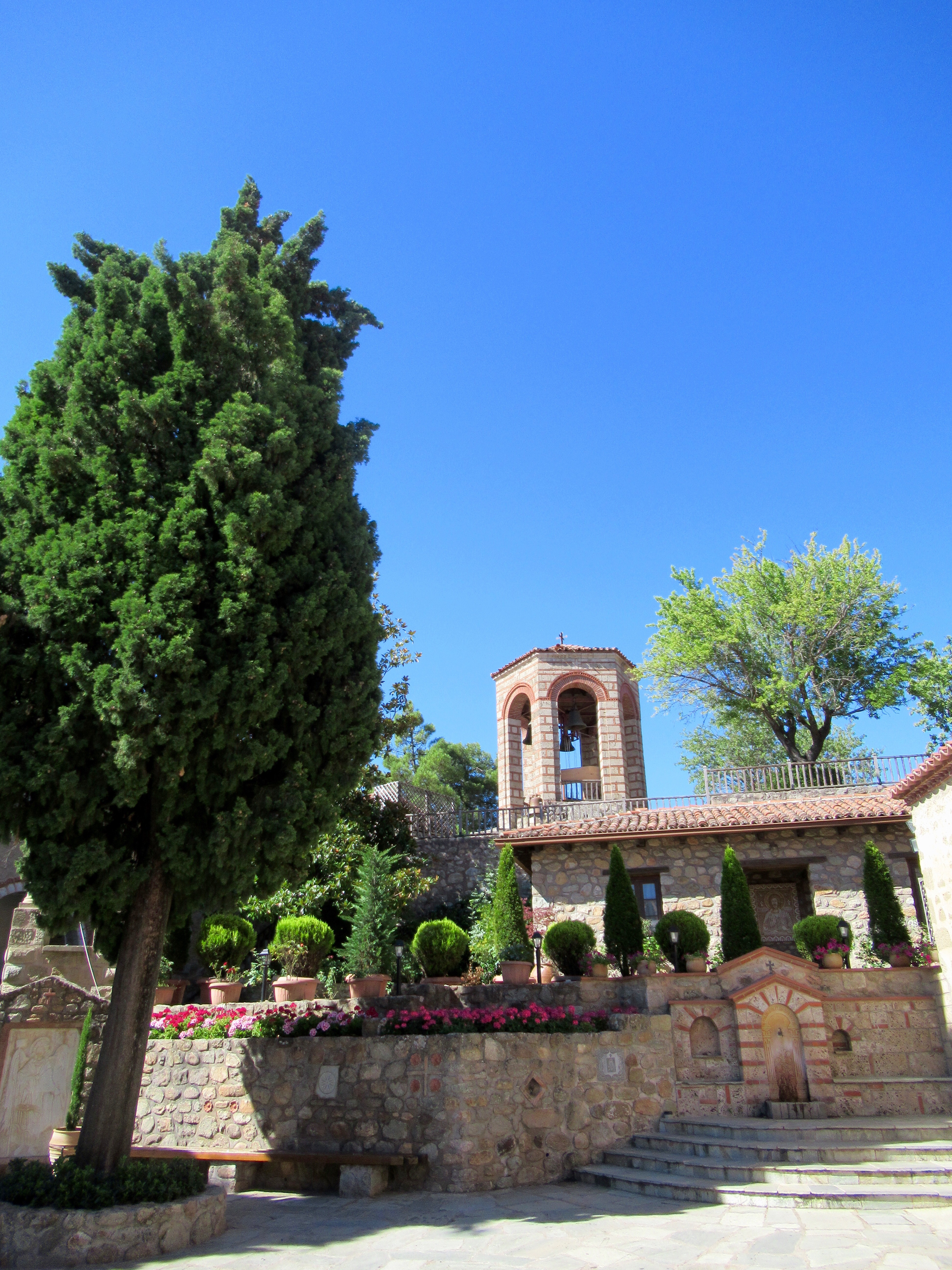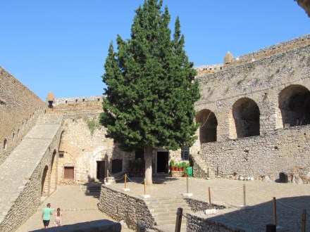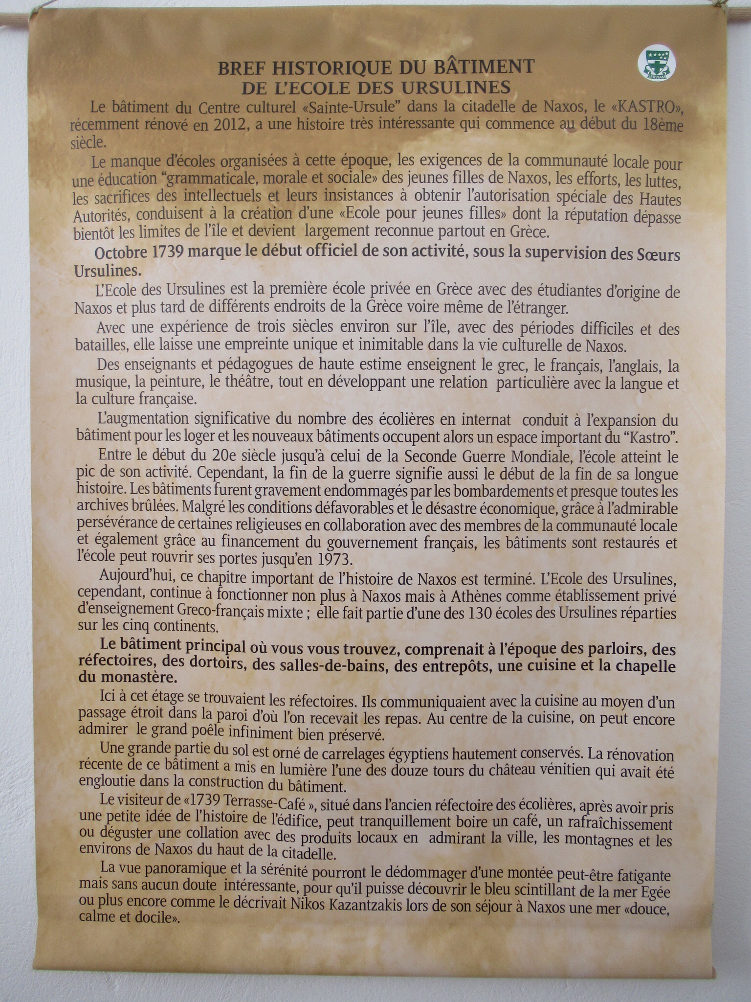 Ce matin, après un petit déjeuner toujours sans café (jamais de cafetière sinon que d’infectes sachet d’instantanés) nous partons gravir les venelles menant au Kastro, l’ancienne Naxos. Les ruelles toujours plus étroites et basses (attentions à vos têtes si vous dépassez le 5’8″!!!) y mènent toutes. De nombreuse chapelles, des musées, quelques expositions et LE café « 1739 » nous charment à coups sûrs! Ce café, construit dans l’ancien réfectoire qu’occupaient les ursulines, offre une vue imprenable sur tout Naxos. Petit moment de recueillement pour Mélanie qui a étudié chez elles à Québec. Elle fera sans doute un spécial pour les anciennes consœurs. Le café y est plus qu’excellent!