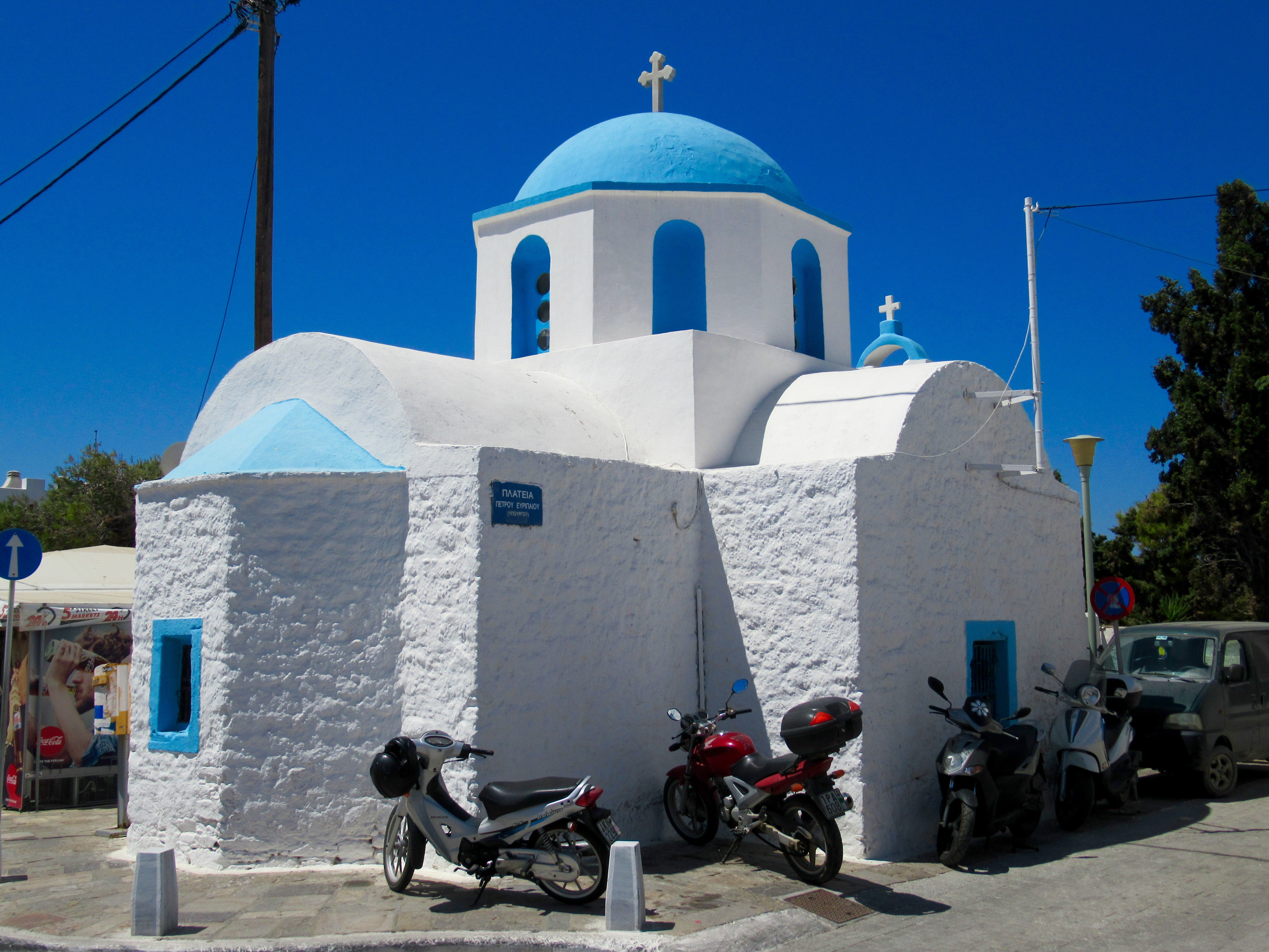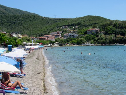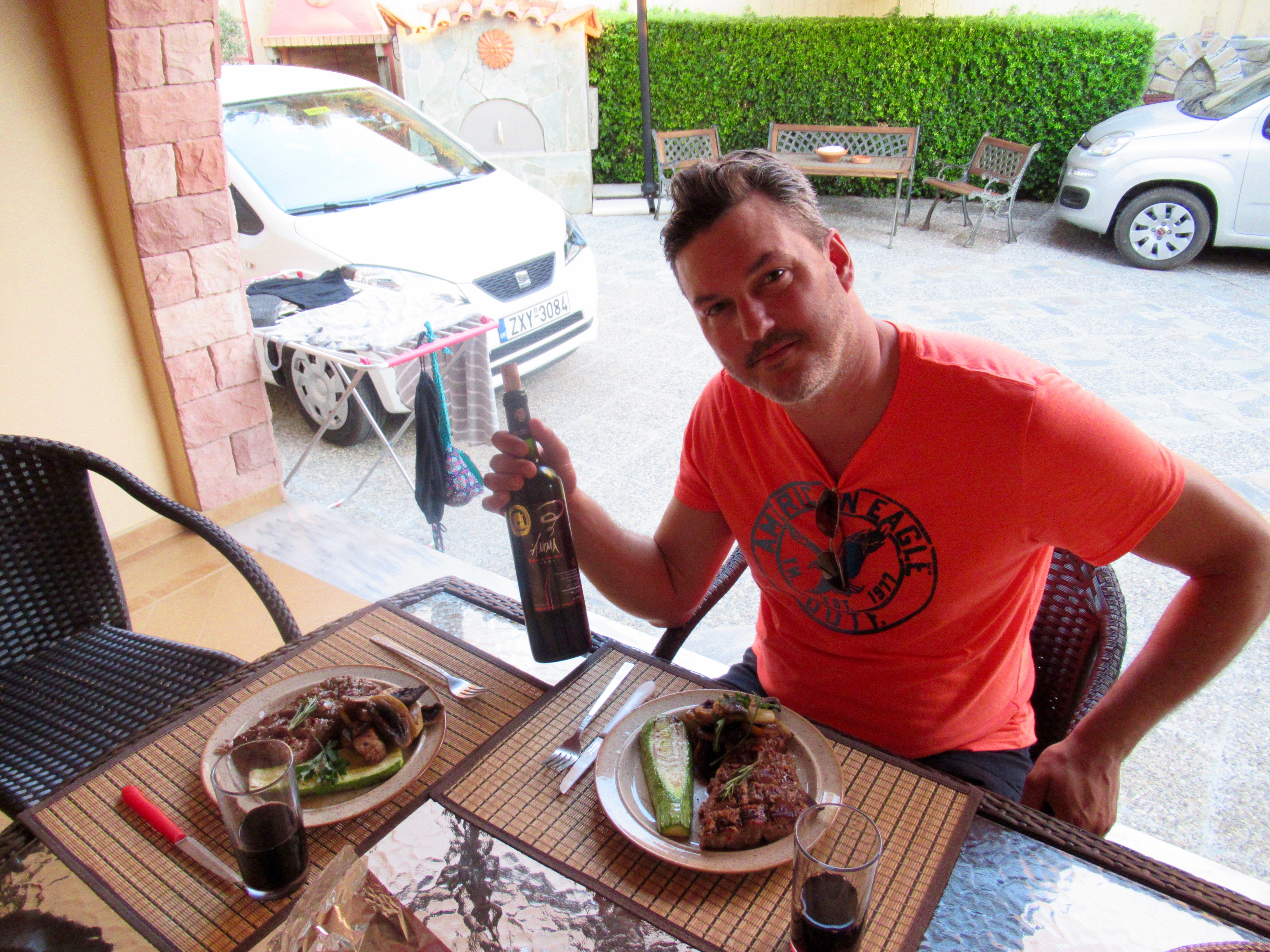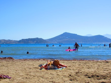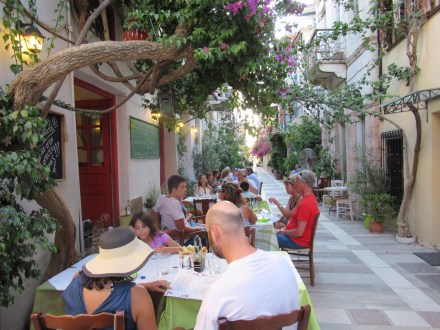 Dès le réveil, nous explorons le « old market » qui est en réalité un entrelacs de ruelles couvertes où les touristes se perdent (car c’est un véritable labyrinthe) et zieutent les innombrables boutiques débordantes de trésors manufacturés ou « hand-made ». Nous n’avons probablement fait que le tiers de ce dédale mais nous décidons d’aller se vautrer à la plage d’Agios Georgios située tout près. « Crowdy » décrirait bien ce tapis de sable à l’eau cristalline et chaude, mais c’est la seule qu’il est raisonnable de faire à pied. Brûlés par le soleil, nous cuisinons une bouffe maison de poulet précédemment mariné et de patates de Naxos qui font tourner la tête de Mélanie, à moins que ce ne soit l’excellent vin de Nemea…