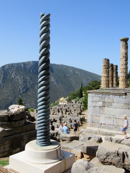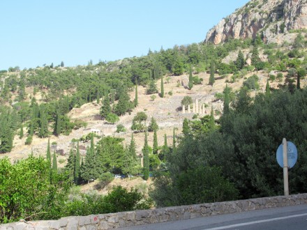 Nous suivons les recommandations des différents guides de lecture que nous feuilletons habituellement la veille pour parcourir les quelques 12 km nous séparant de Delphes antique dès 8h du matin; c’est qu’ils annoncent chaud et l’endroit est extrêmement visité par les touristes. La route sinueuse présente soudainement un flanc de montagne baigné par le soleil en altitude. Nous y sommes, mais pas les premiers! Il fait déjà chaud et le site escarpé n’offre  aucune ombre au tableau…