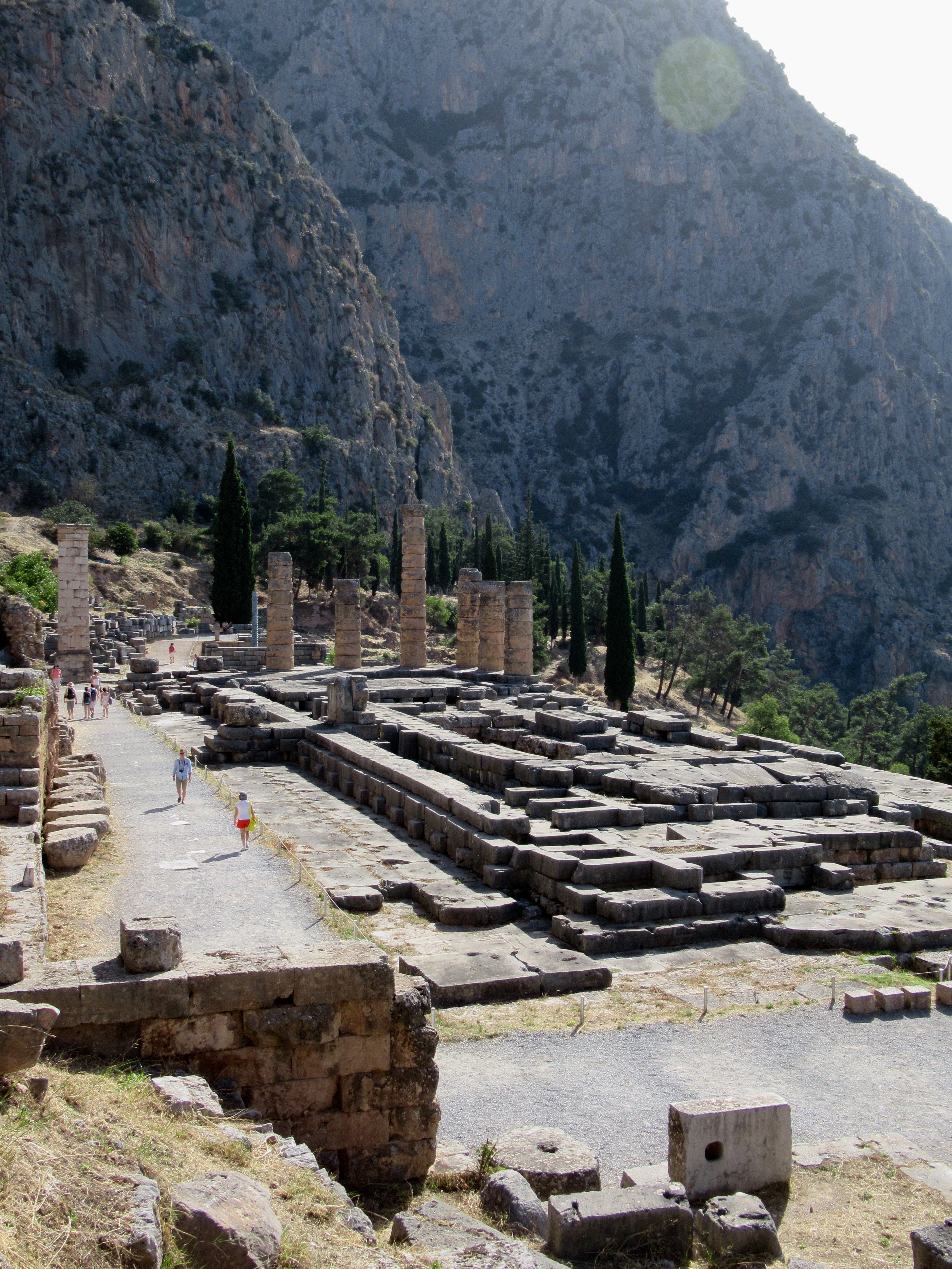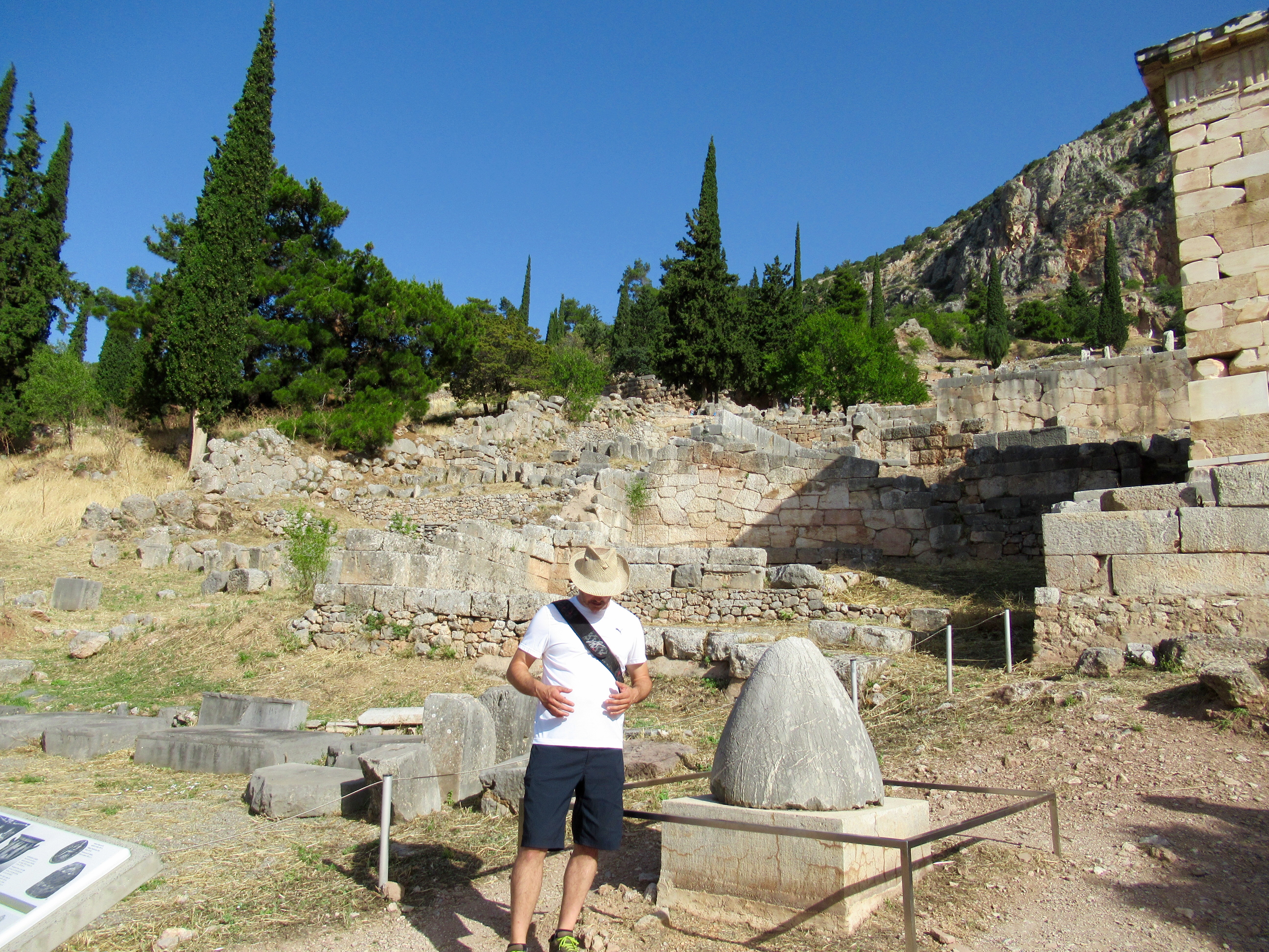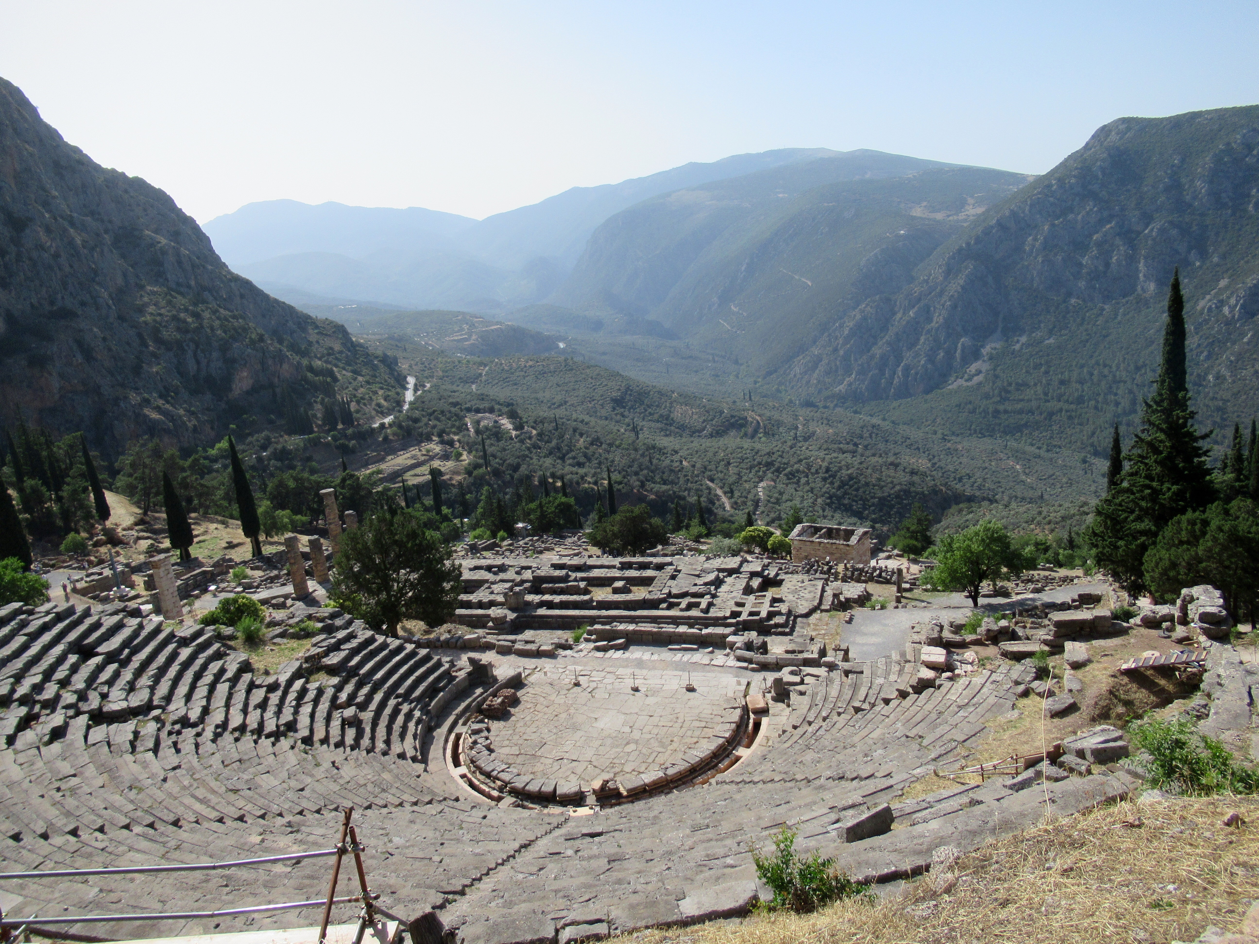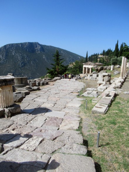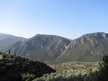 Le site est intensément baigné de lumière. Parmis les vestiges de plus de deux millénaires et demi on retrouve un mur de soutènement en pierres hexagonales ocres sur lesquelles sont inscrites environ 800 textes d’affranchissements d’esclaves, le rocher de la Sybille (première prophétesse avant la pythie),  un temple appelé « le trésor » des Athéniens (le site regorgeait de « trésors » de différentes nations), le temple d’Apollon qui était le centre d’intérêt, le théâtre si bien conservé et quelques centaines de mètres vraiment plus haut, un stade de 200 m de long muni de gradins où avaient lieu des épreuves aux 4 ans. Je vous invite à lire sur internet l’histoire de Delphes et des oracles pour en savoir plus. C’est à l’ombre d’un des rares arbres que l’on prend conscience de l’âge des vestiges dominant la vallée qui s’ouvre devant Delphes. C’est grandiose comme en témoignent les photos…