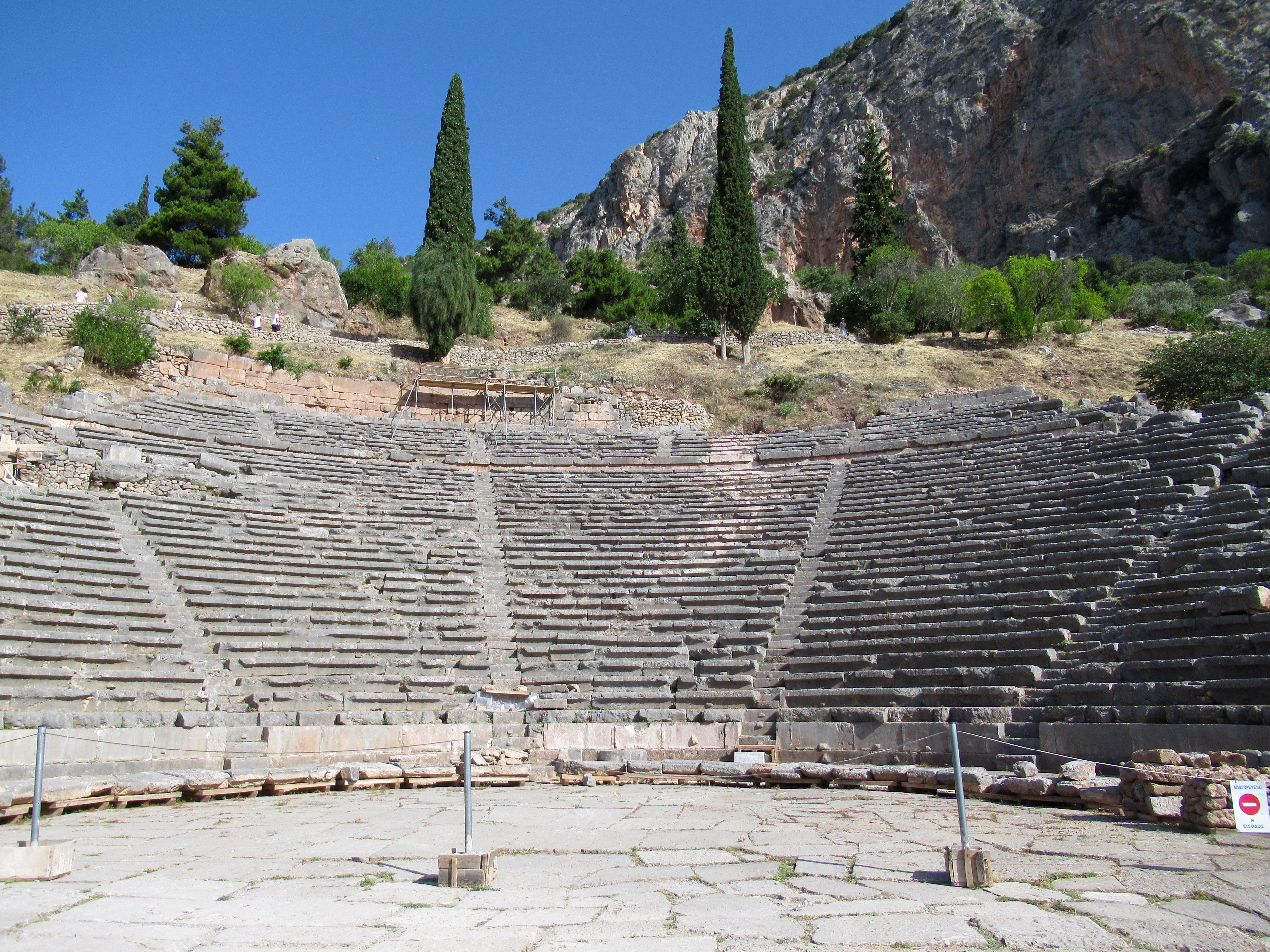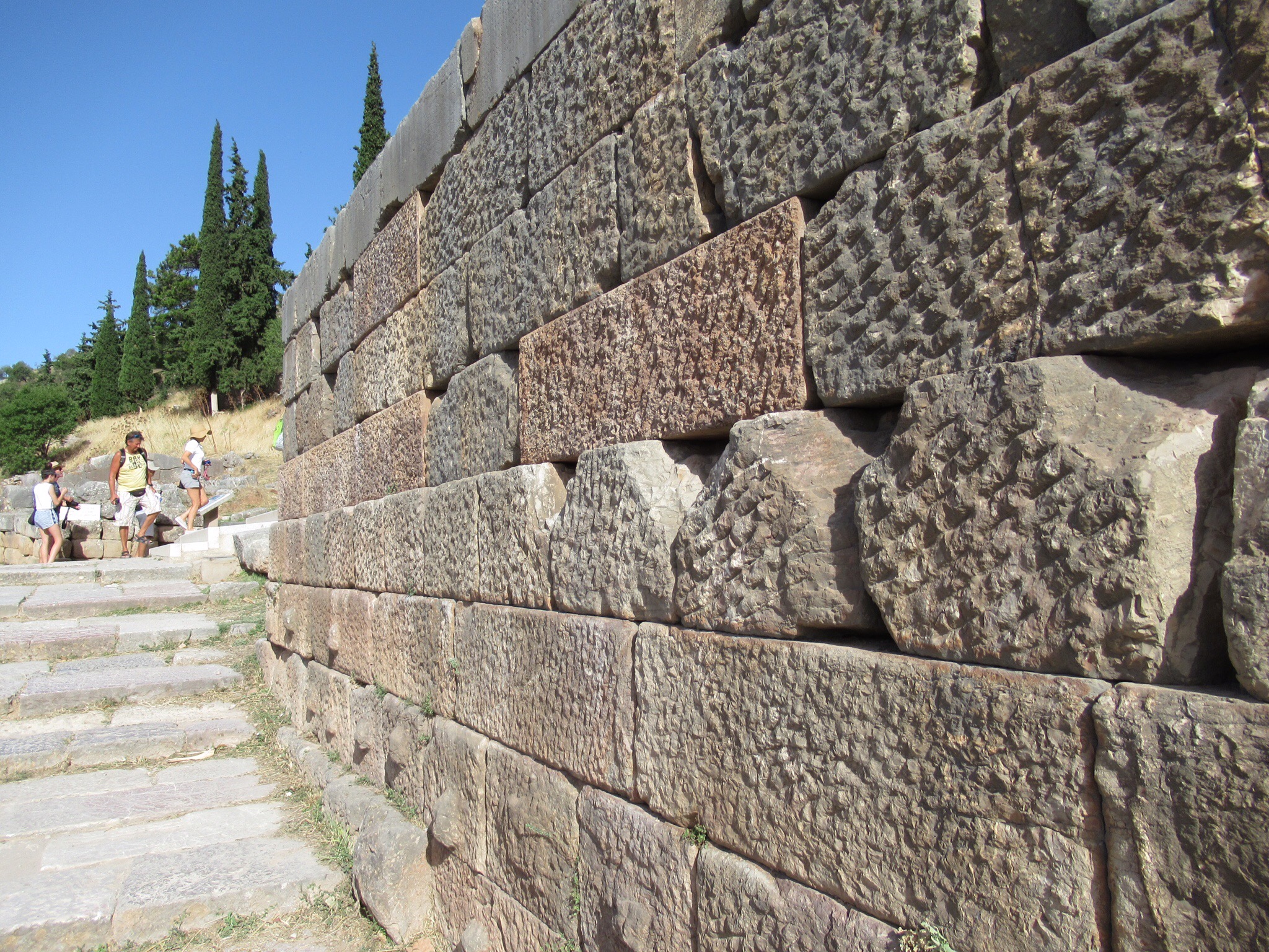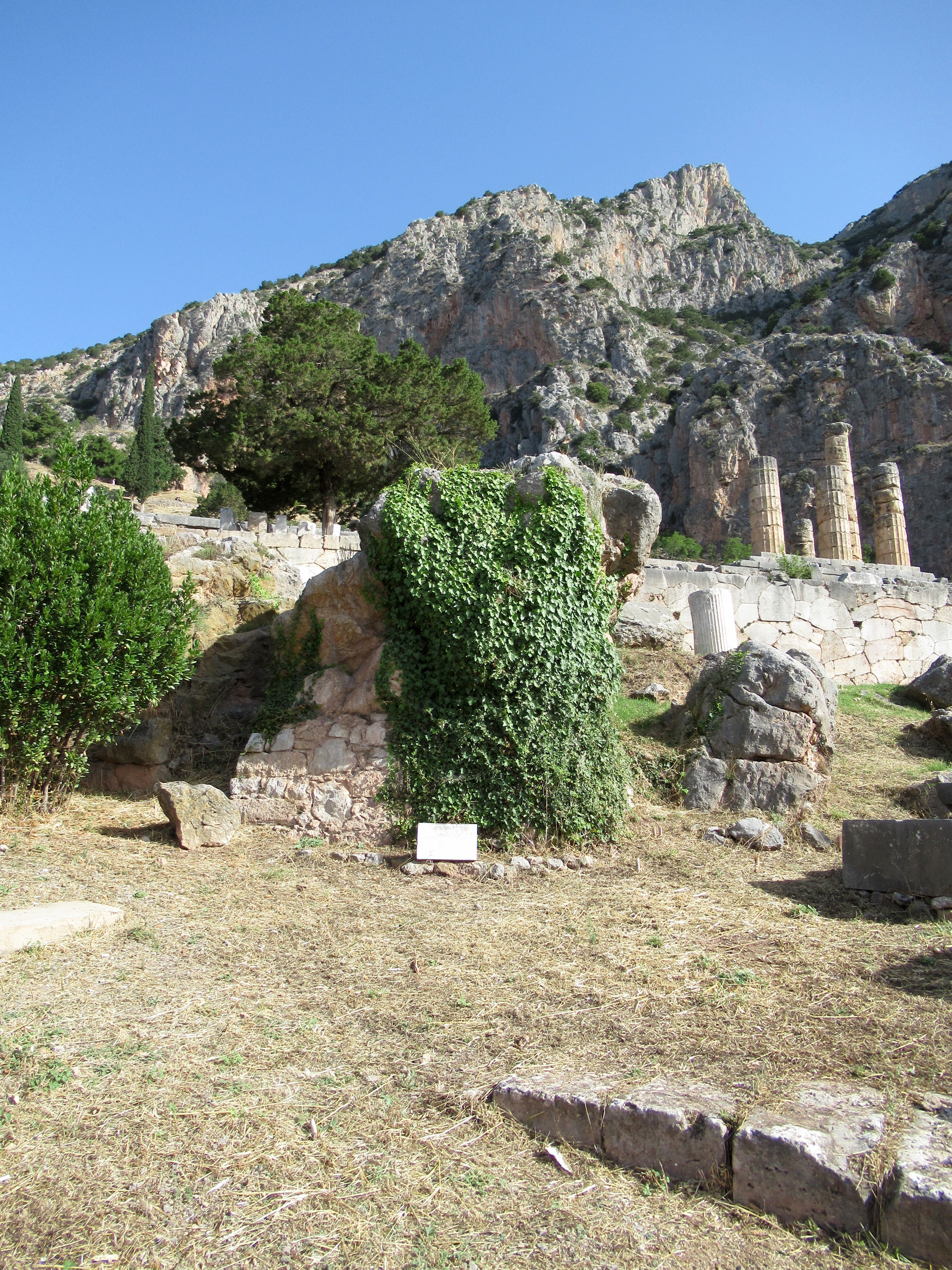 Le site est intensément baigné de lumière. Parmis les vestiges de plus de deux millénaires et demi on retrouve un mur de soutènement en pierres hexagonales ocres sur lesquelles sont inscrites environ 800 textes d’affranchissements d’esclaves, le rocher de la Sybille (première prophétesse avant la pythie),  un temple appelé « le trésor » des Athéniens (le site regorgeait de « trésors » de différentes nations), le temple d’Apollon qui était le centre d’intérêt, le théâtre si bien conservé et quelques centaines de mètres vraiment plus haut, un stade de 200 m de long muni de gradins où avaient lieu des épreuves aux 4 ans. Je vous invite à lire sur internet l’histoire de Delphes et des oracles pour en savoir plus. C’est à l’ombre d’un des rares arbres que l’on prend conscience de l’âge des vestiges dominant la vallée qui s’ouvre devant Delphes. C’est grandiose comme en témoignent les photos…