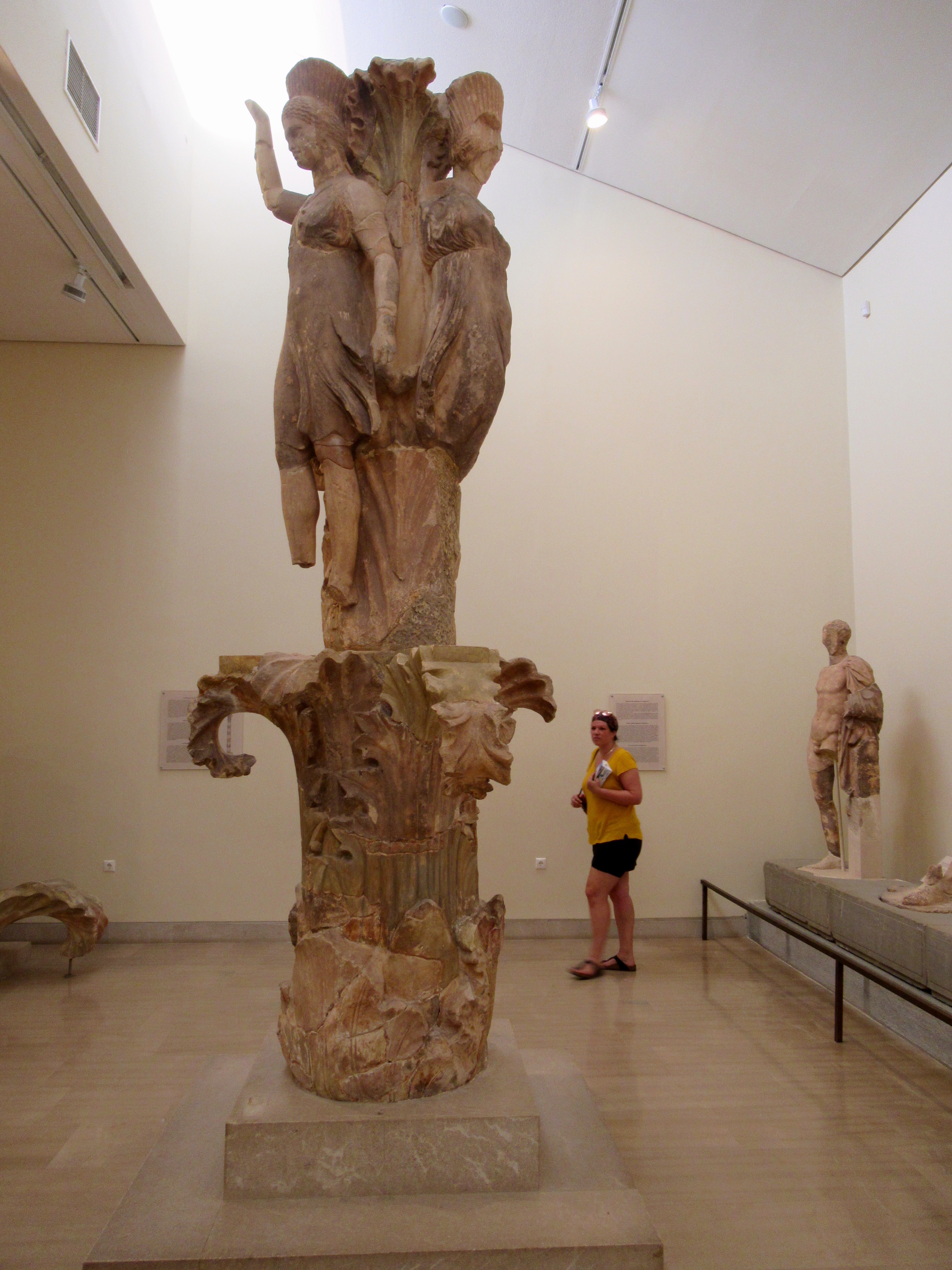 Un détour au musée est obligatoire ne serait-ce que pour l’air climatisé. On y trouve surtout les pièces manquantes du site qui ont été révélées lors d’une fouille historique en 1896 avec photos d’archives pour bien saisir l’ampleur de ces découvertes ensevelies et préservées du temps et des pillages. À noter la présence d’un immense sphinx qui culminait au sommet d’une colonne et les deux statues des jumeaux ainsi qu’une sculpture en bronze (rare à cette époque) de l’Aurige, un conducteur de char. Fait étrange, il est permis de photographier sans flash dans presque tous les musées, mais nous ne pouvions faire de selfies dans celui-ci! Toujours mal compris en quoi ça dérange les statues…