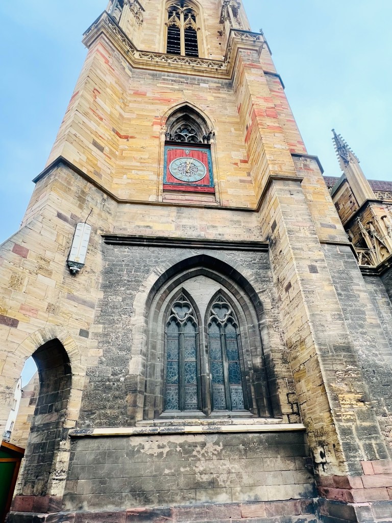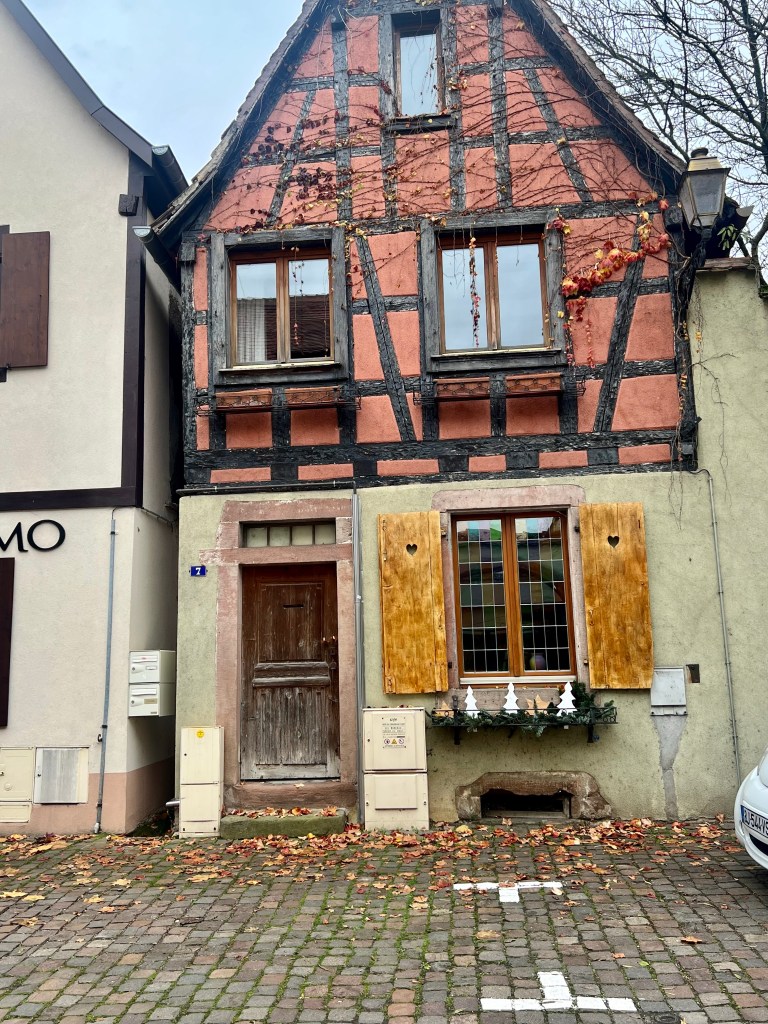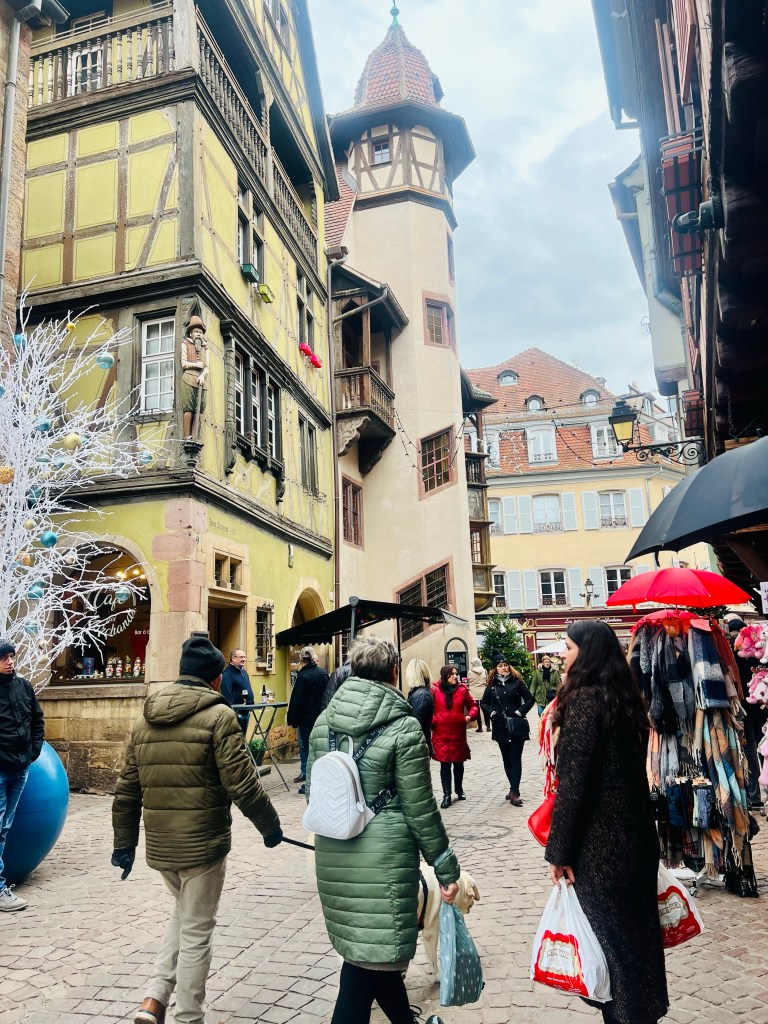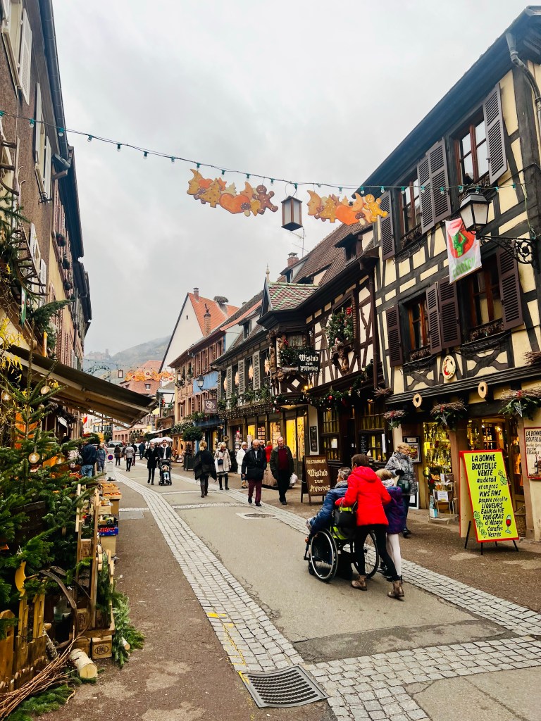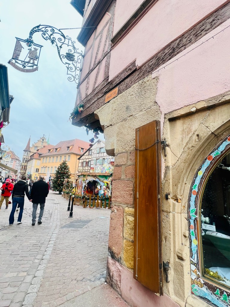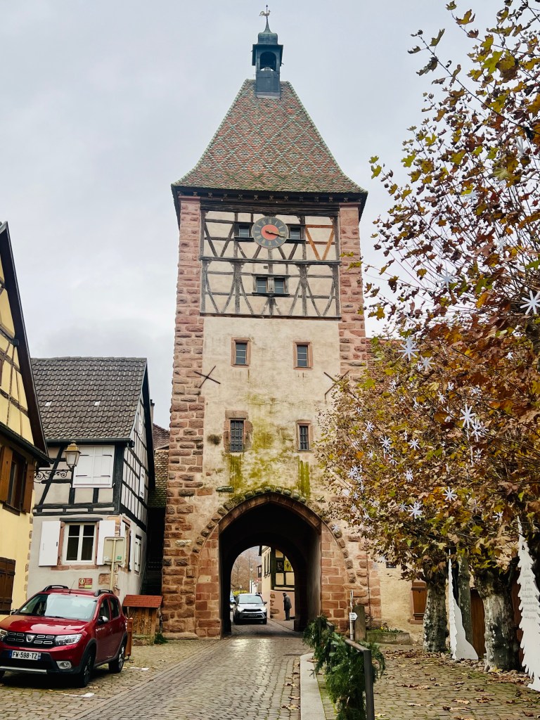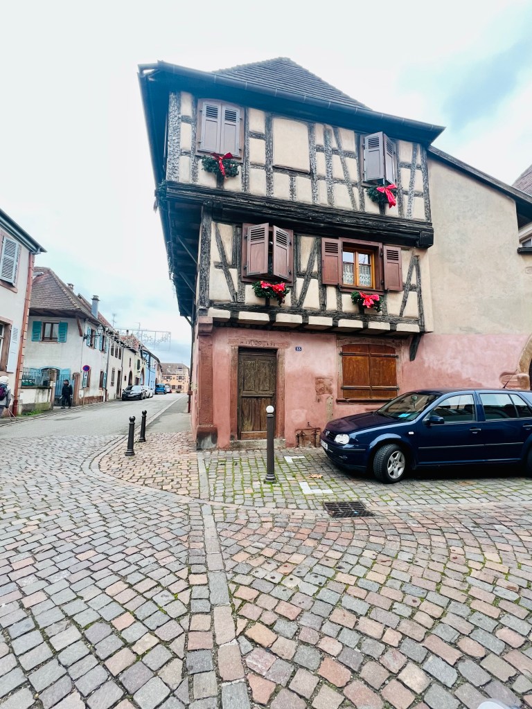 Une visite qui vaut le détour si vous êtes en Alsace! Et puis, il faut se le dire, ça fait changement des colombages! Parlant de ce style, on a ensuite déboulé dans quelques villages, pittoresques à souhait! Nous avons débuté par Sélestat, 3e ville en importance en Alsace. C’était jour de marché et le marché de Noël était ouvert. Il y avait du monde, mais pas trop de touristes. On a goûté une sorte de galette de pommes de terre mais n’avons pas trouvé de restaurant « convenable » ce qui signifie, selon nos critères : « où l’on mange assis, à la chaleur, sans y laisser notre peau ». Ça semble simple comme ça mais DU COUP, ça ne l’est pas! On a trouvé La Mosaïque convenable à Bergheim.