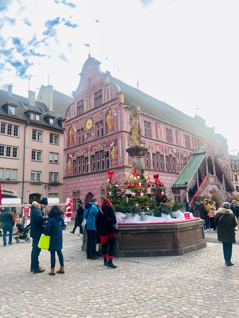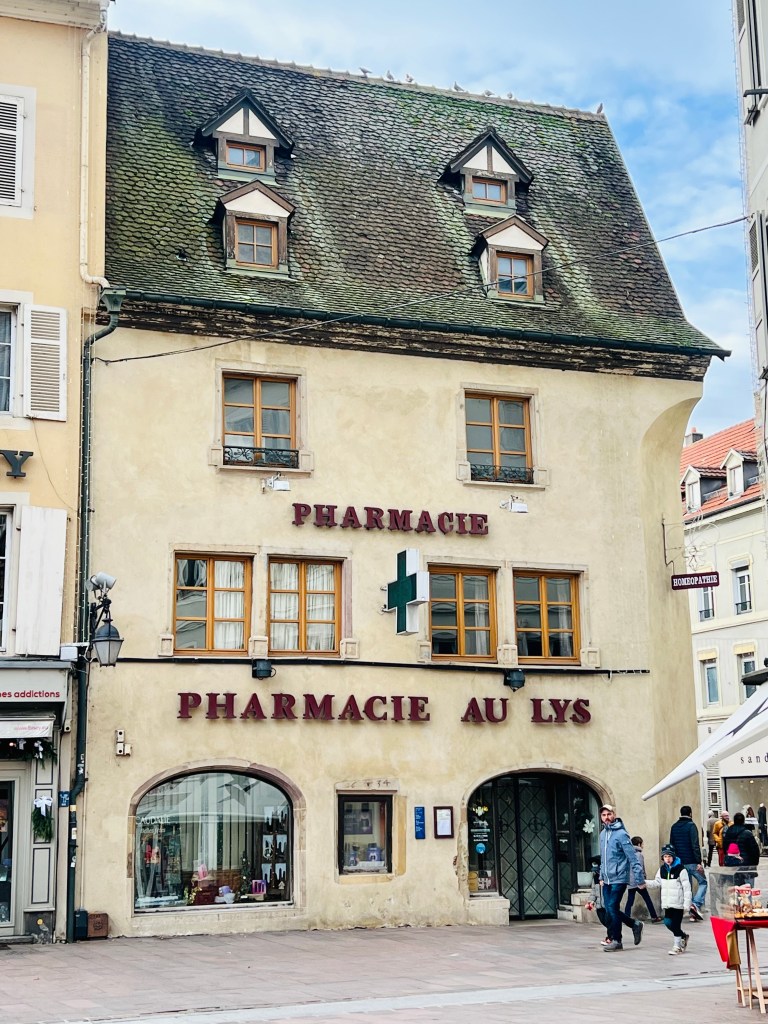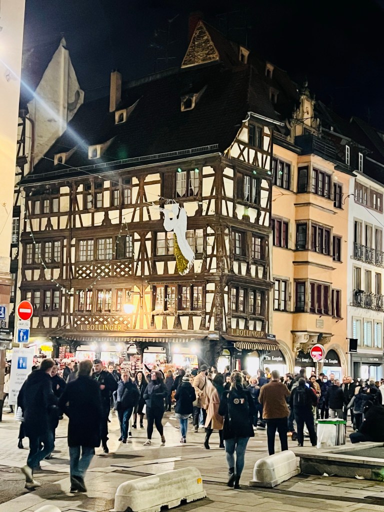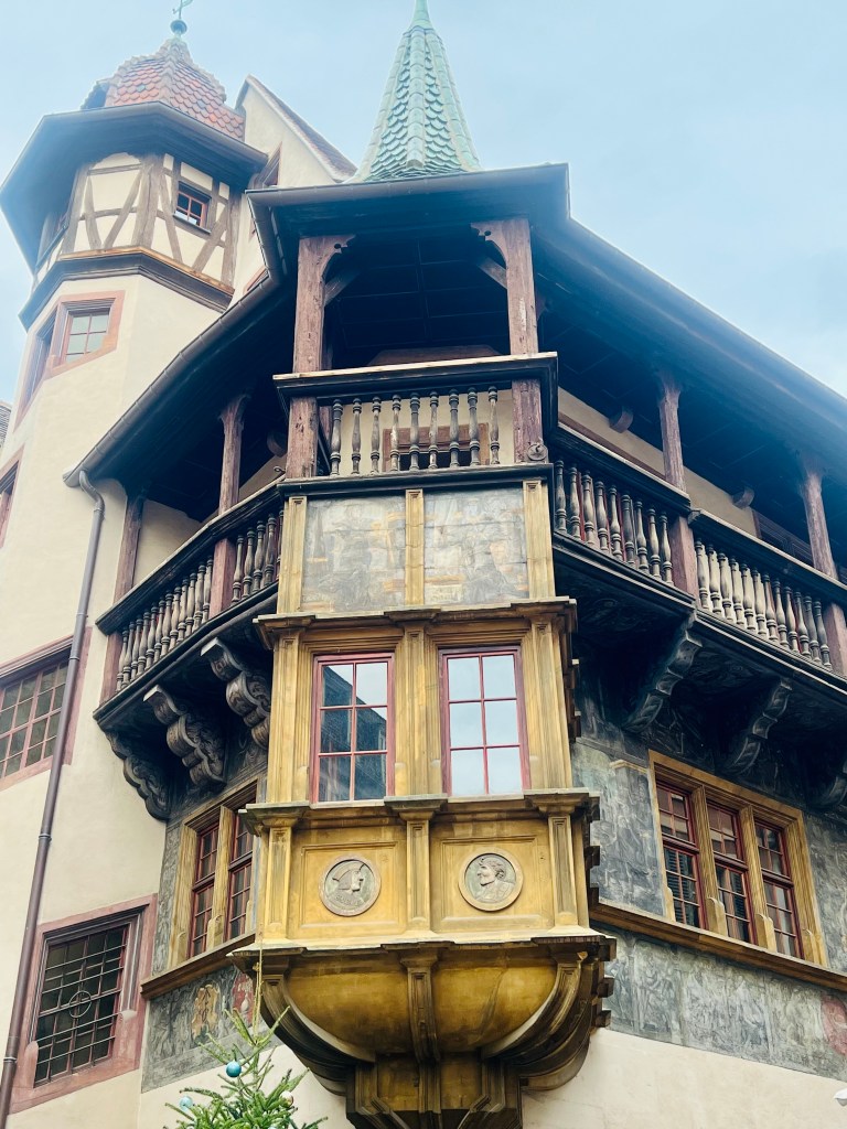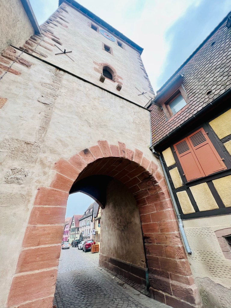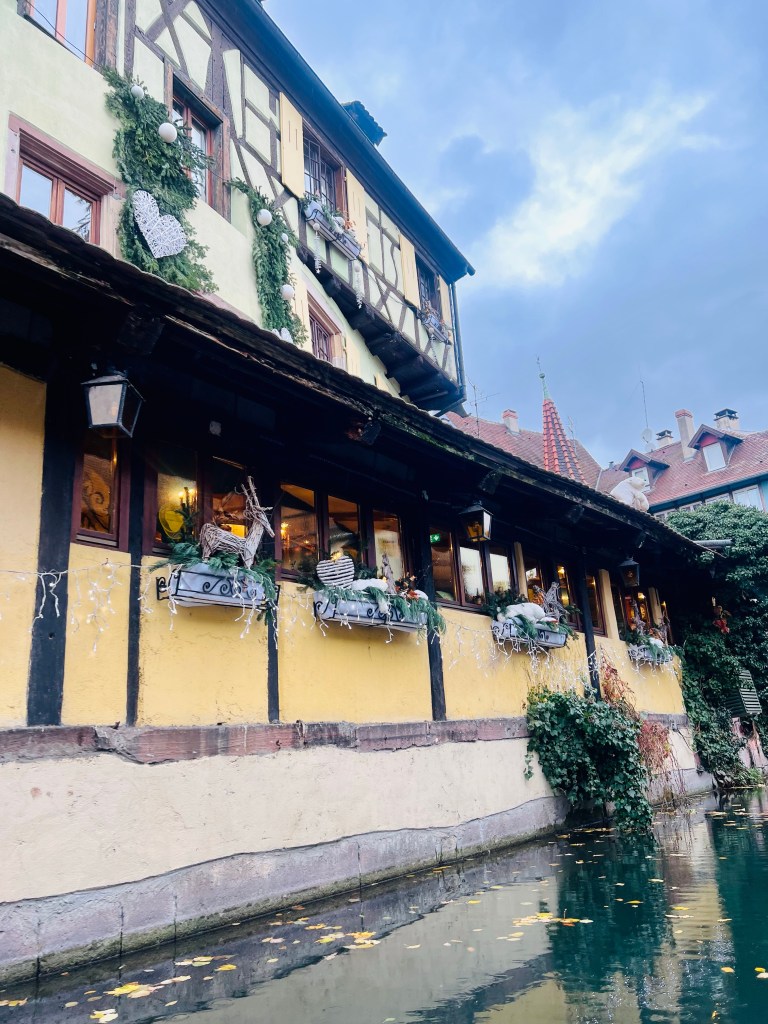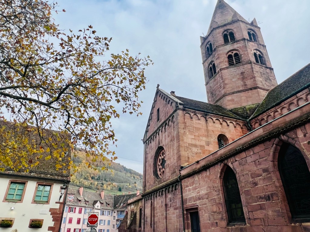 Une visite qui vaut le détour si vous êtes en Alsace! Et puis, il faut se le dire, ça fait changement des colombages! Parlant de ce style, on a ensuite déboulé dans quelques villages, pittoresques à souhait! Nous avons débuté par Sélestat, 3e ville en importance en Alsace. C’était jour de marché et le marché de Noël était ouvert. Il y avait du monde, mais pas trop de touristes. On a goûté une sorte de galette de pommes de terre mais n’avons pas trouvé de restaurant « convenable » ce qui signifie, selon nos critères : « où l’on mange assis, à la chaleur, sans y laisser notre peau ». Ça semble simple comme ça mais DU COUP, ça ne l’est pas! On a trouvé La Mosaïque convenable à Bergheim.