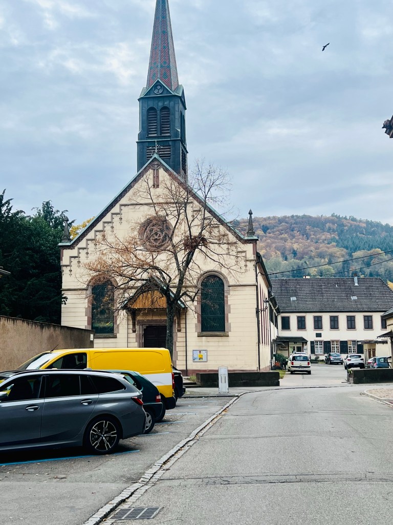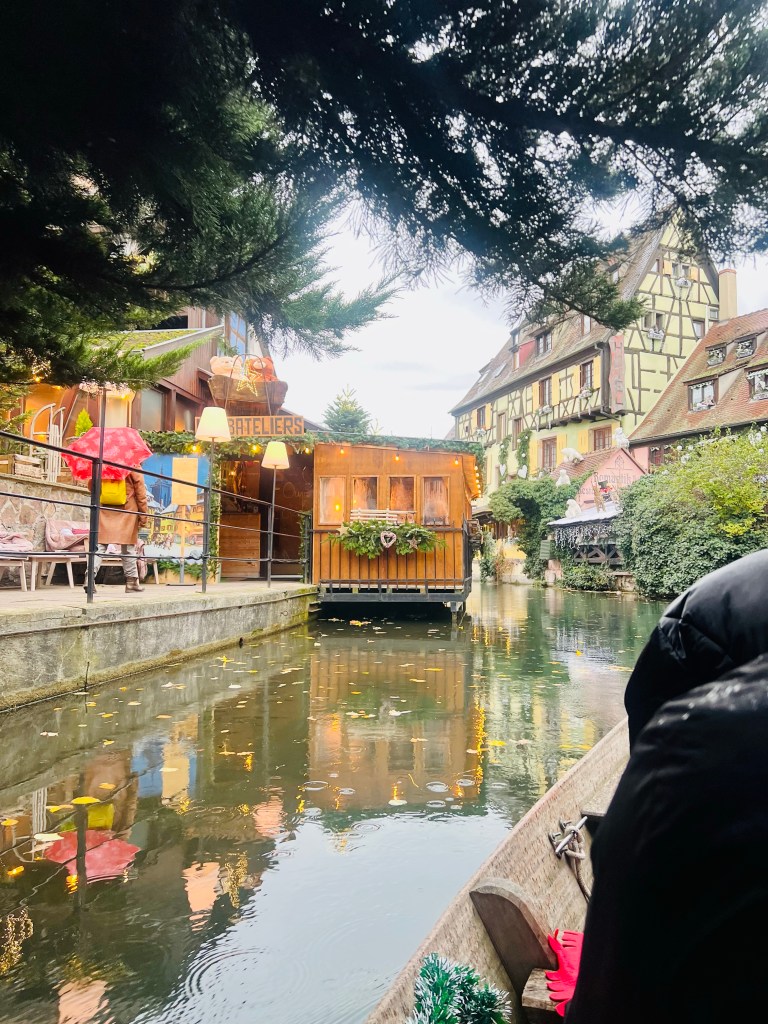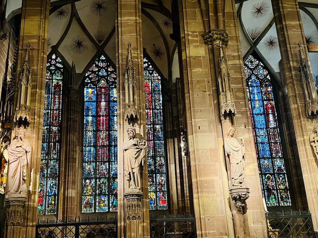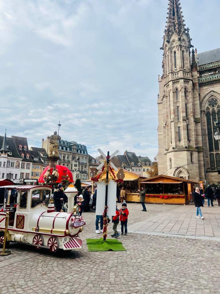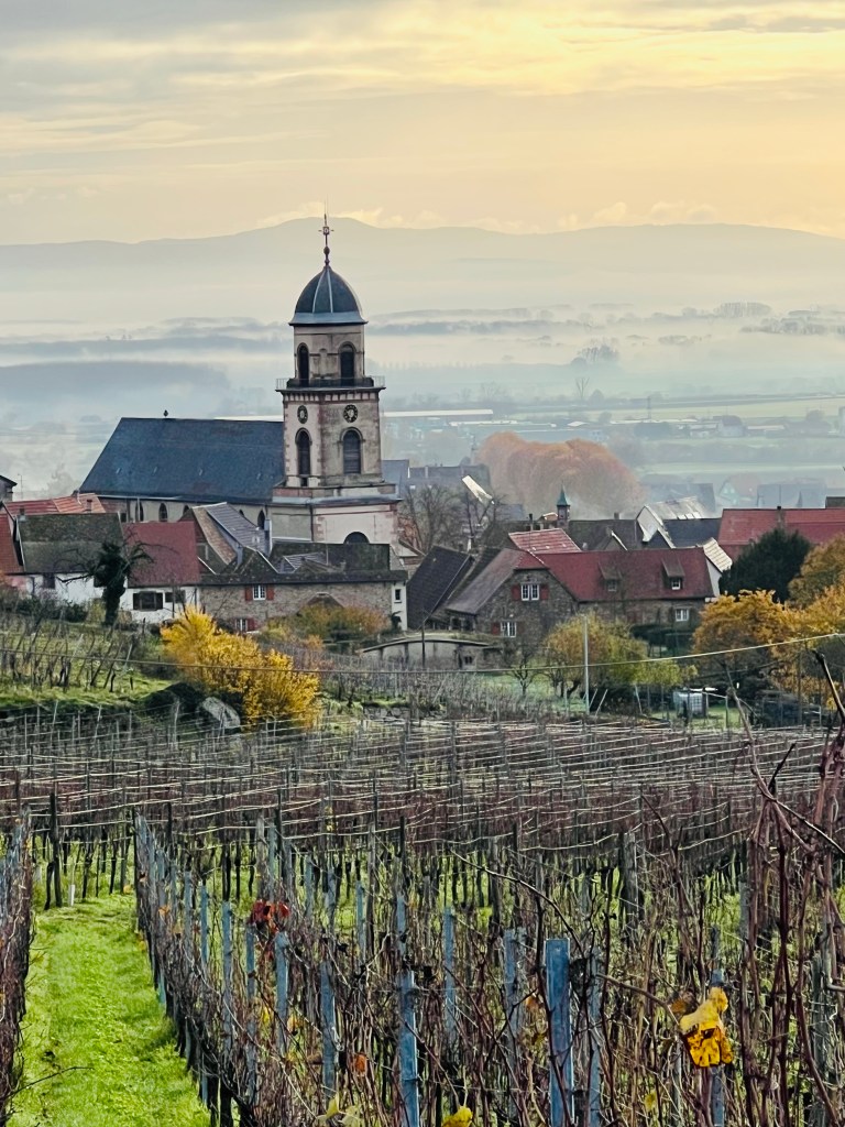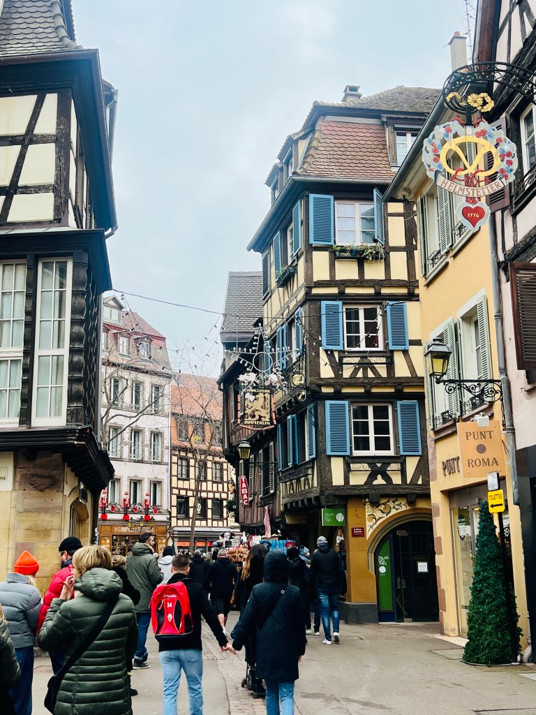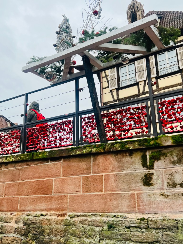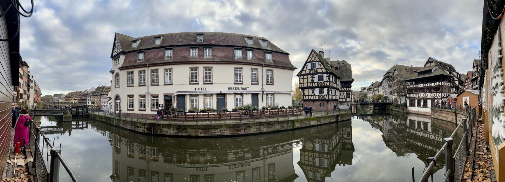 Une visite qui vaut le détour si vous êtes en Alsace! Et puis, il faut se le dire, ça fait changement des colombages! Parlant de ce style, on a ensuite déboulé dans quelques villages, pittoresques à souhait! Nous avons débuté par Sélestat, 3e ville en importance en Alsace. C’était jour de marché et le marché de Noël était ouvert. Il y avait du monde, mais pas trop de touristes. On a goûté une sorte de galette de pommes de terre mais n’avons pas trouvé de restaurant « convenable » ce qui signifie, selon nos critères : « où l’on mange assis, à la chaleur, sans y laisser notre peau ». Ça semble simple comme ça mais DU COUP, ça ne l’est pas! On a trouvé La Mosaïque convenable à Bergheim.