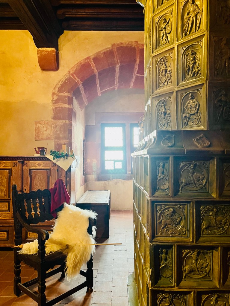 D’abord, il y a eu le Château. Nonon, pas un château pour boire du vin! On a fait dans le sérieux cette fois. Nous sommes allé découvrir le Château du Haut-Koenigsbourg. Sa construction d’origine remonte au 12e siècle. Le visiter constitue presque un « voyage » au moyen-âge, difficile de comparer, n’y étant jamais allé! Premièrement, que l’on soit à l’intérieur ou l’extérieur, même combat, il fait froid. Et si les « kachelofen » sont nombreux dans cette résidence, encore faudrait-il y allumer un feu pour profiter de la chaleur qu’ils dispersaient naguère!