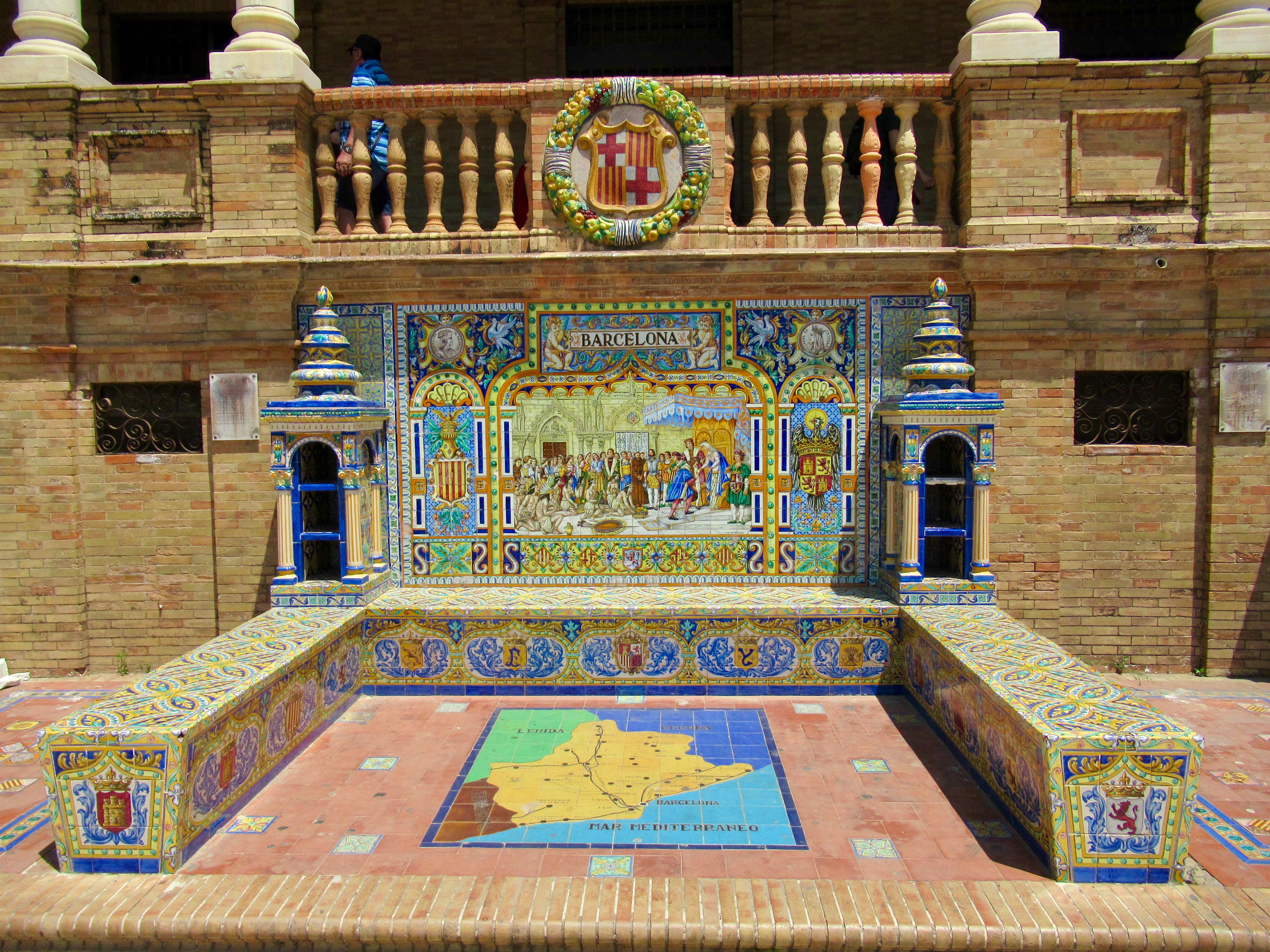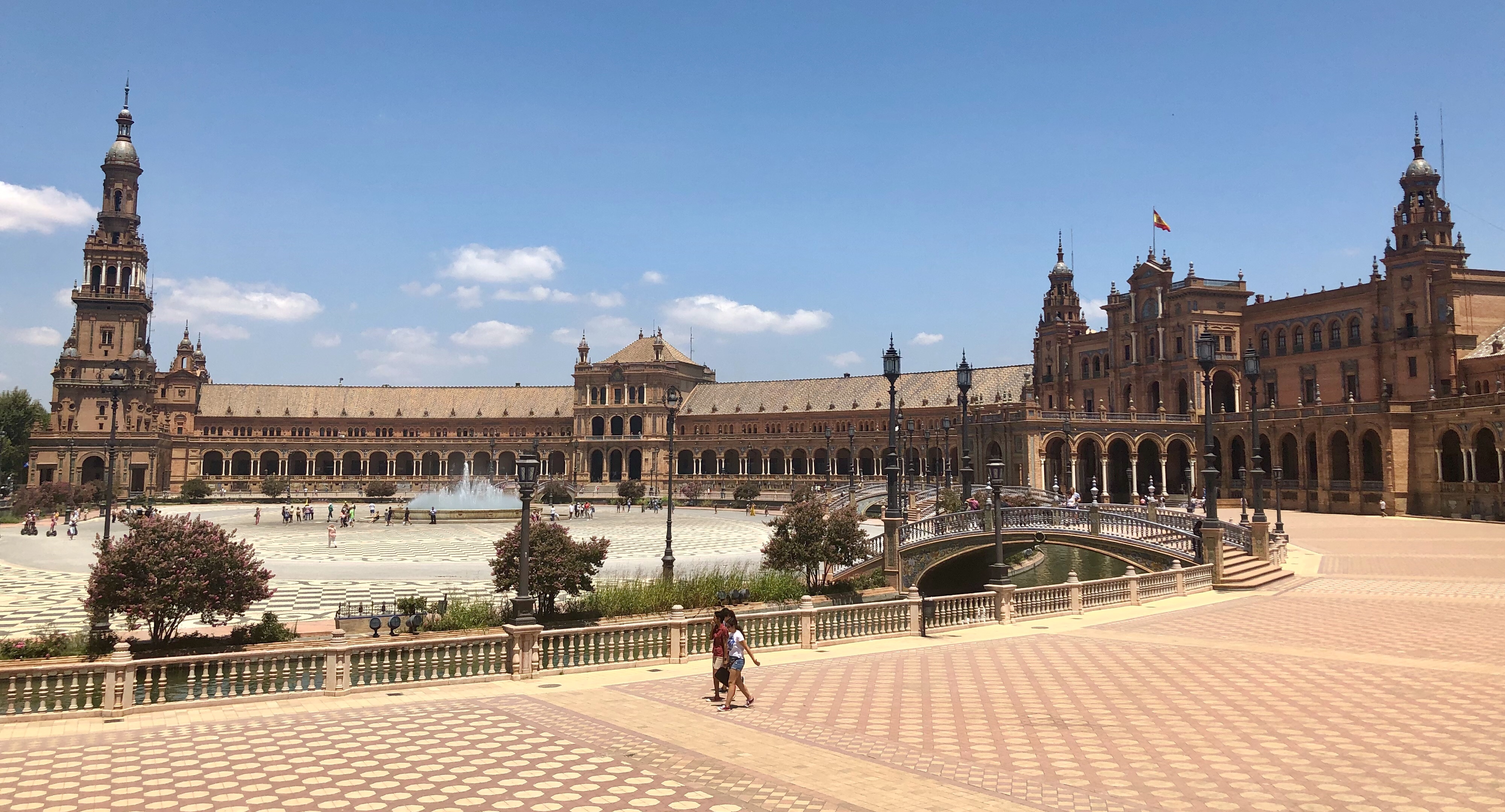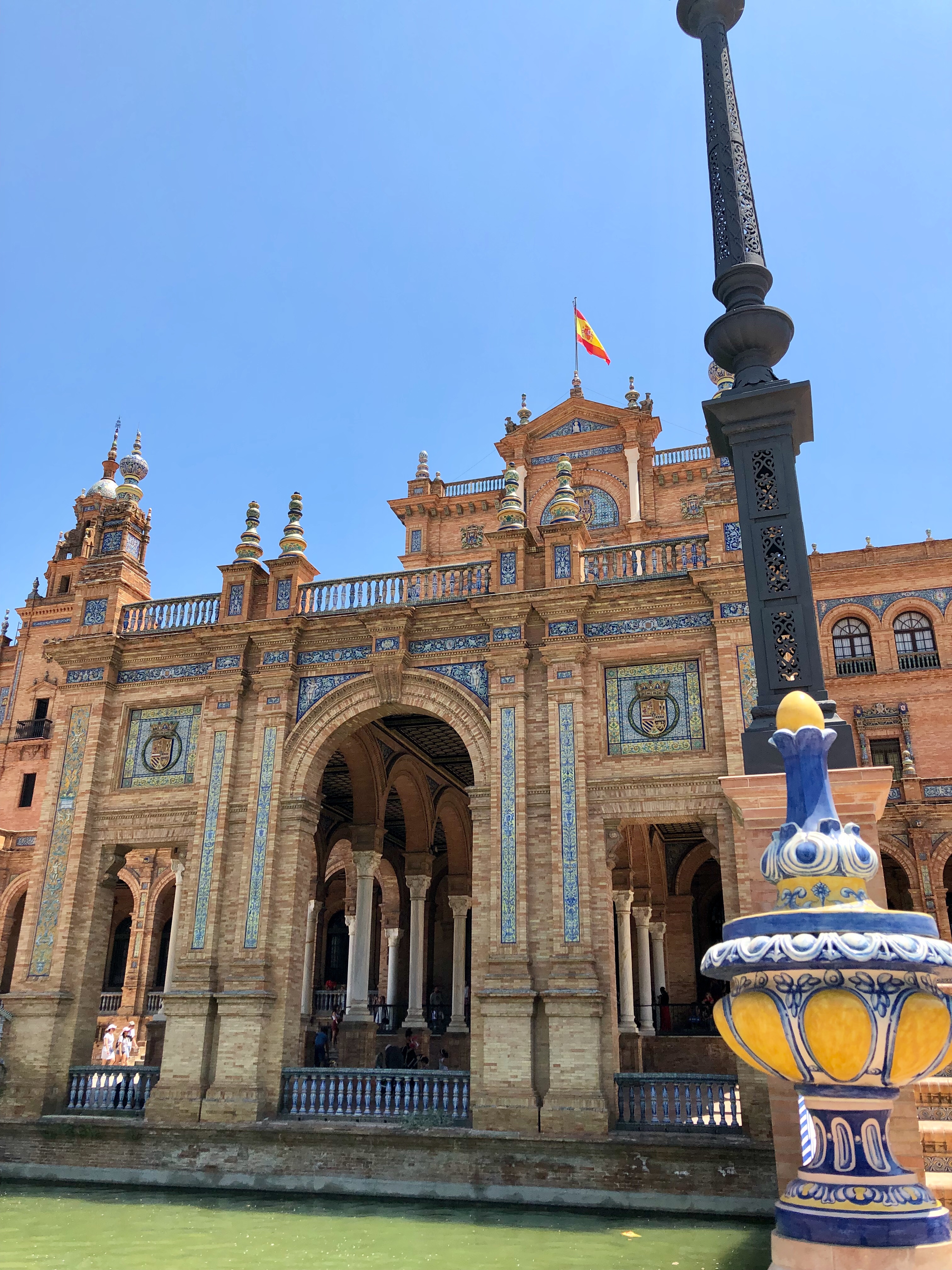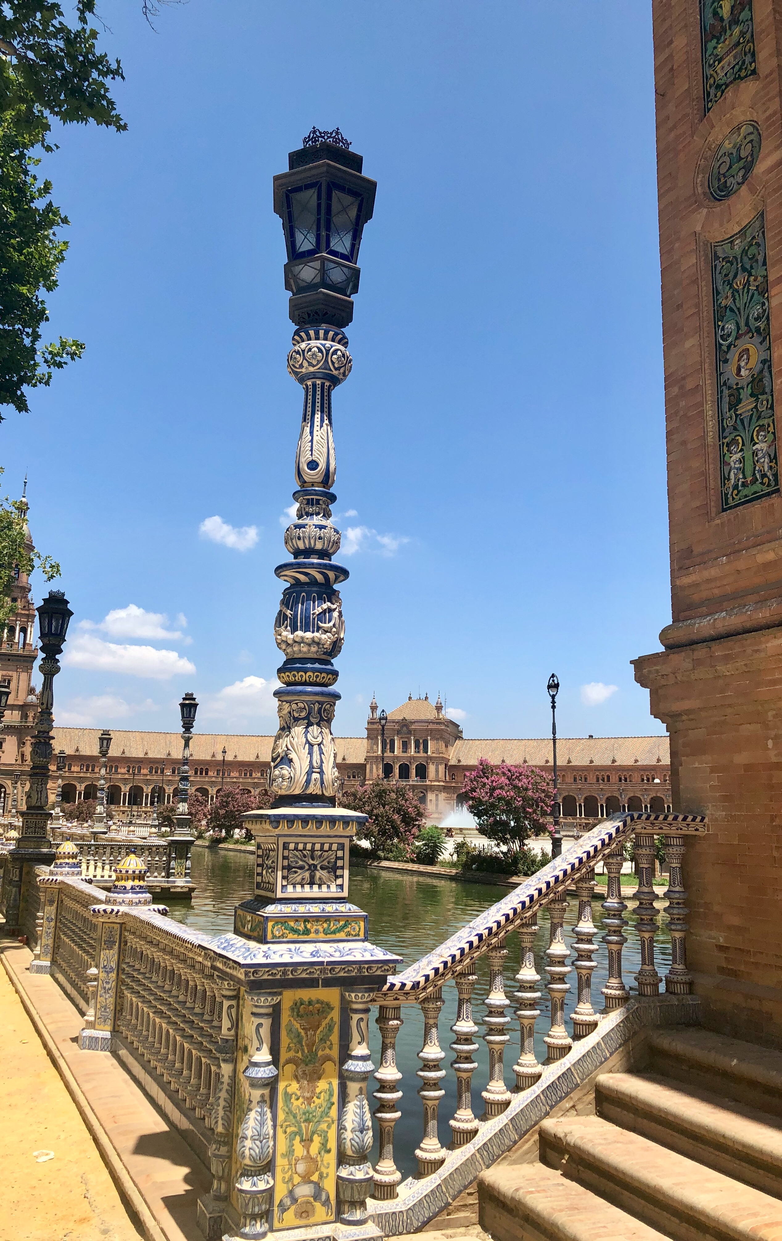 C’est au travers des producteurs d’huile d’olives venus manifester que nous atteignons la tant espérée Plaza de España. Un chef-d’œuvre! La cinquantaine de provinces espagnoles y est représentée, par des bancs, blasons et azuléjos. De toutes beauté! Des couleurs vibrantes! Un canal, des ponts tout aussi colorés, des lampadaires, et sous ses arches, un groupe de musiciens et des danseuses de flamenco 💃! Olé! Un des beaux moments de ce séjour à Séville!