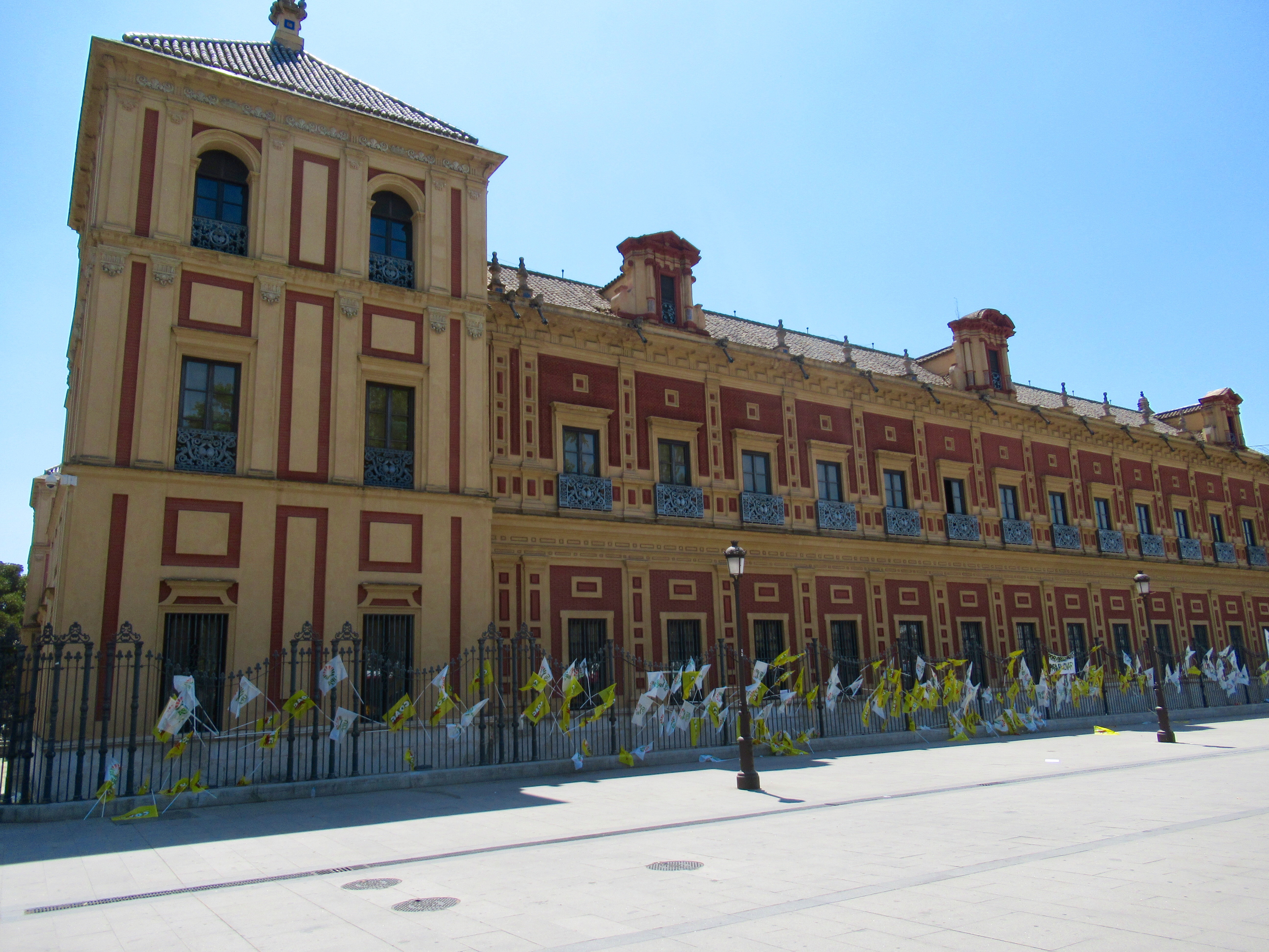 On descend ensuite vers les arènes que nous choisissons finalement de ne pas visiter, nous gravissons les marches de la Torre del Oro d’où nous avons une magnifique vue sur le fleuve et tout Séville.On passe devant l’Assemblée andalouse où le personnel s’occupe de retirer les nombreux drapeaux laissés par les manifestants.Le casino.