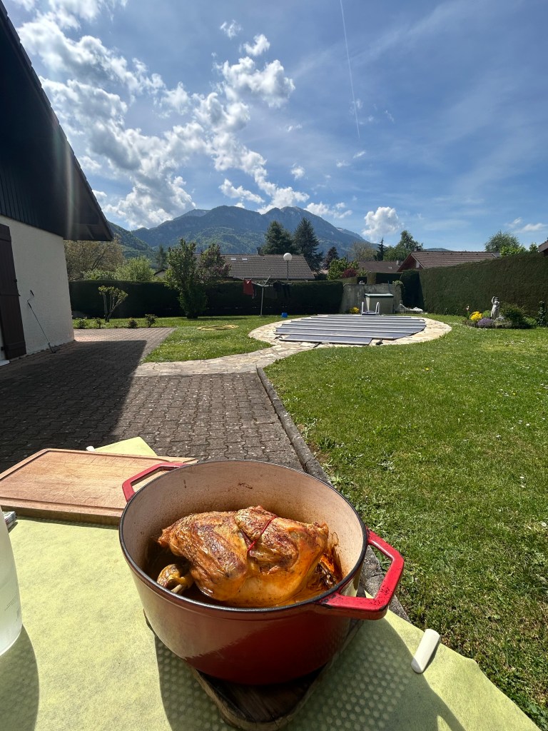 Belle matinée à la maison avec nos hôtes à surveiller les opérations! Ils se sont levés tôt et ont allumé le feu dans le four extérieur. À la cuisson aujourd’hui : le poulet de grain pour le déjeuner, les pommes de terre, le pâté aux courgettes.