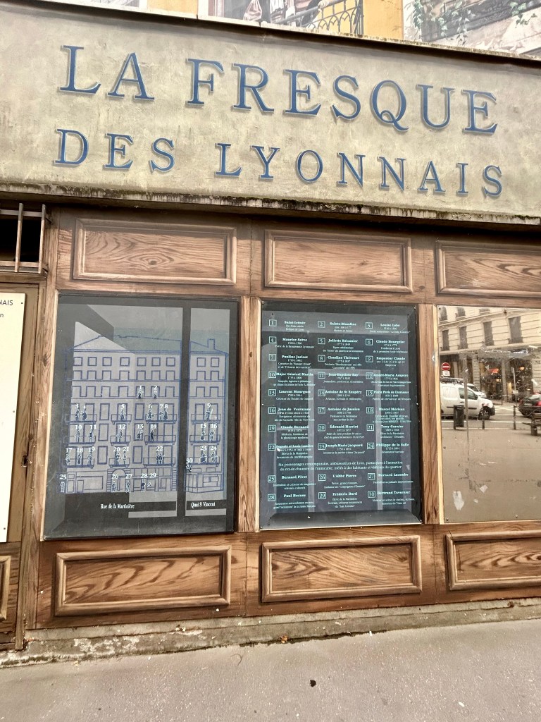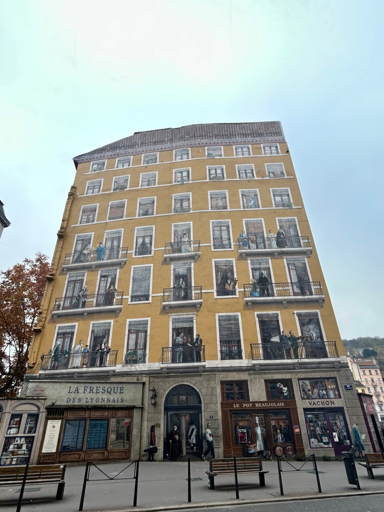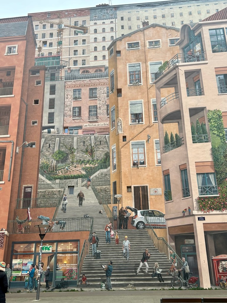 Pause bière et burger pour remettre des barres sur mon indicateur énergie! Avant d’entreprendre la montée, je passe devant la Fresque des Lyonnais. Réalisée en 1994 et 1995, elle fait 800m carrés. 24 personnages de l’histoire lyonnaise y sont peints et 6 contemporains.