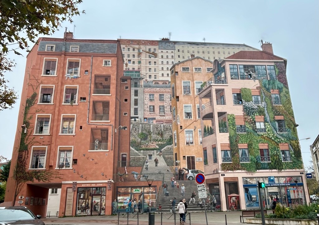 Tout en haut, le mur des Canuts. Cette immense trompe-l’œil a été peint pour la première fois en 1987. Depuis, il est régulièrement mis à jour, s’adaptant aux changements de la vie du quartier. Pour plus d’informations, cliquez ici